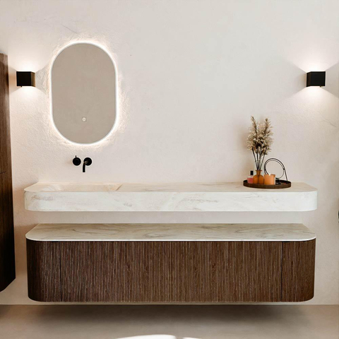 Matériaux naturels dans des tons chauds. Les nervures verticales apportent rythme et texture au design, tandis que le chêne confère une apparence chaleureuse et artisanale. Choisissez parmi 5 teintes de bois OAK, WALNUT, DUSK, SHADOW et RUBY, des couleurs de bois soigneusement sélectionnées pour enrichir les salles de bains modernes et classiques.