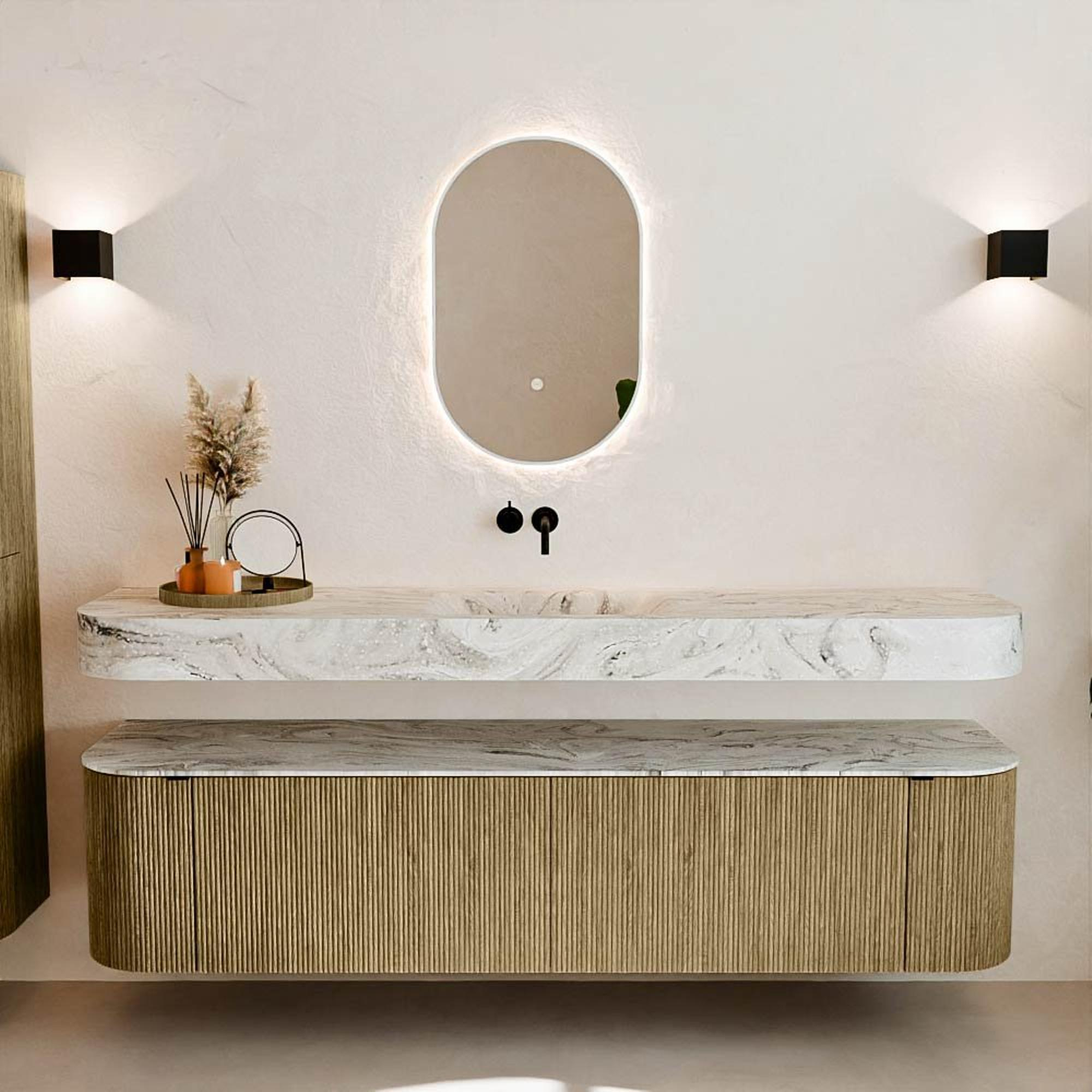 Matériaux naturels dans des tons chauds. Les rainures verticales apportent rythme et texture au design, tandis que le chêne confère une apparence chaleureuse et artisanale. Choisissez parmi 5 teintes de bois OAK, WALNUT, DUSK, SHADOW et RUBY, des couleurs de bois soigneusement sélectionnées pour enrichir les salles de bains modernes et classiques.