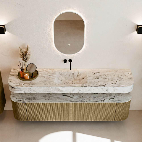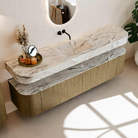 Au-dessus du meuble flotte une vasque suspendue assortie aux coins arrondis – parfaitement adaptée à la forme du meuble. La vasque est réalisée en Solid Surface et suit subtilement les lignes du meuble inférieur, créant ainsi un ensemble harmonieux. Le plan de travail en Solid Surface forme une base solide, facile d'entretien et complète la combinaison.