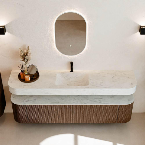 Au-dessus du meuble flotte une vasque suspendue assortie aux coins arrondis – parfaitement adaptée à la forme du meuble. La vasque est réalisée en Solid Surface et suit subtilement les lignes du meuble inférieur, créant ainsi un ensemble harmonieux. Le plan de travail en Solid Surface forme une base solide, facile d'entretien et complète la combinaison.