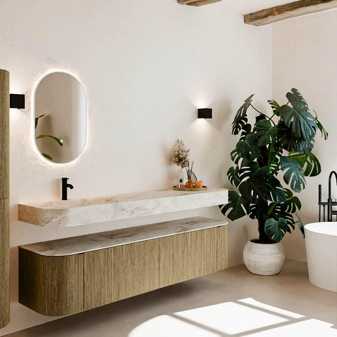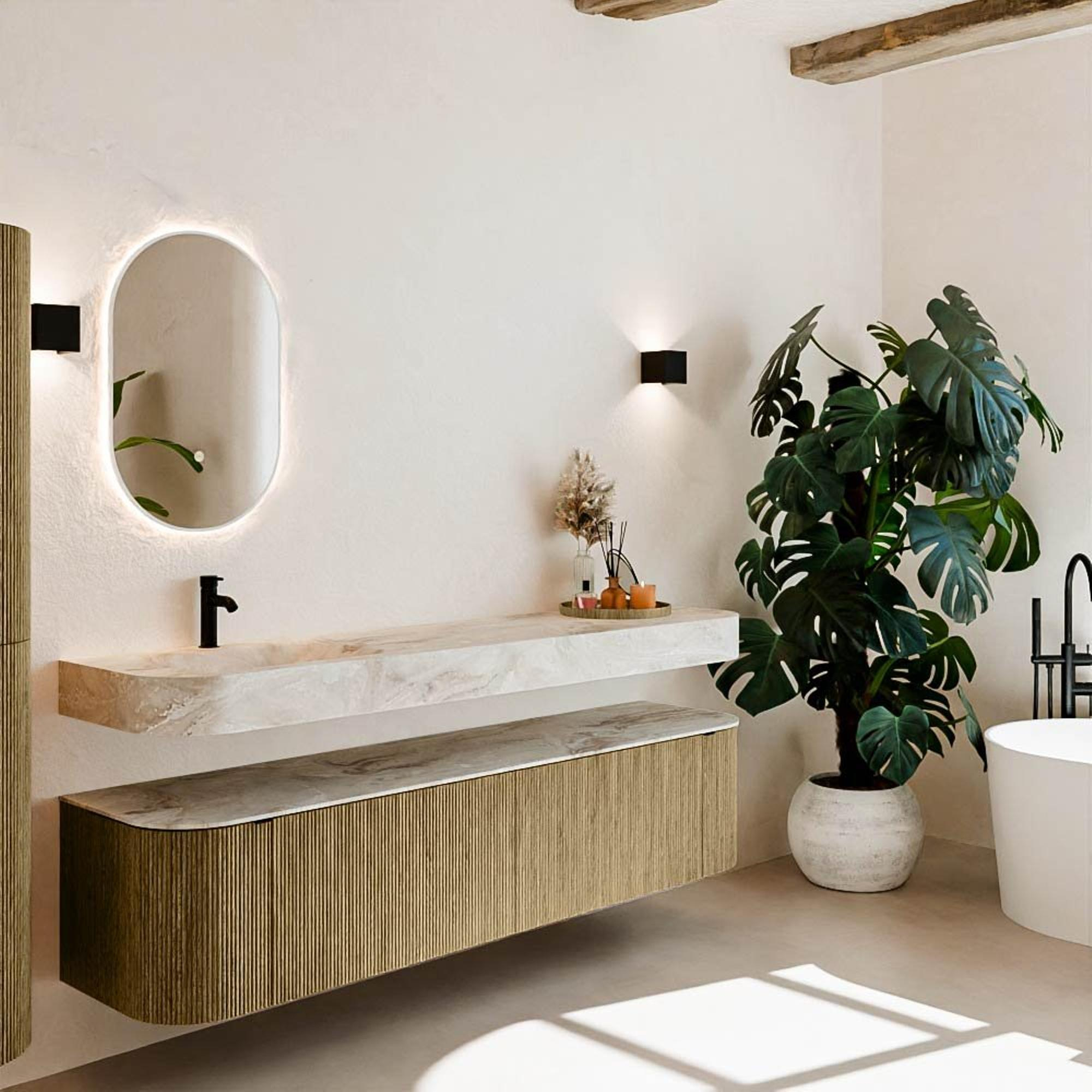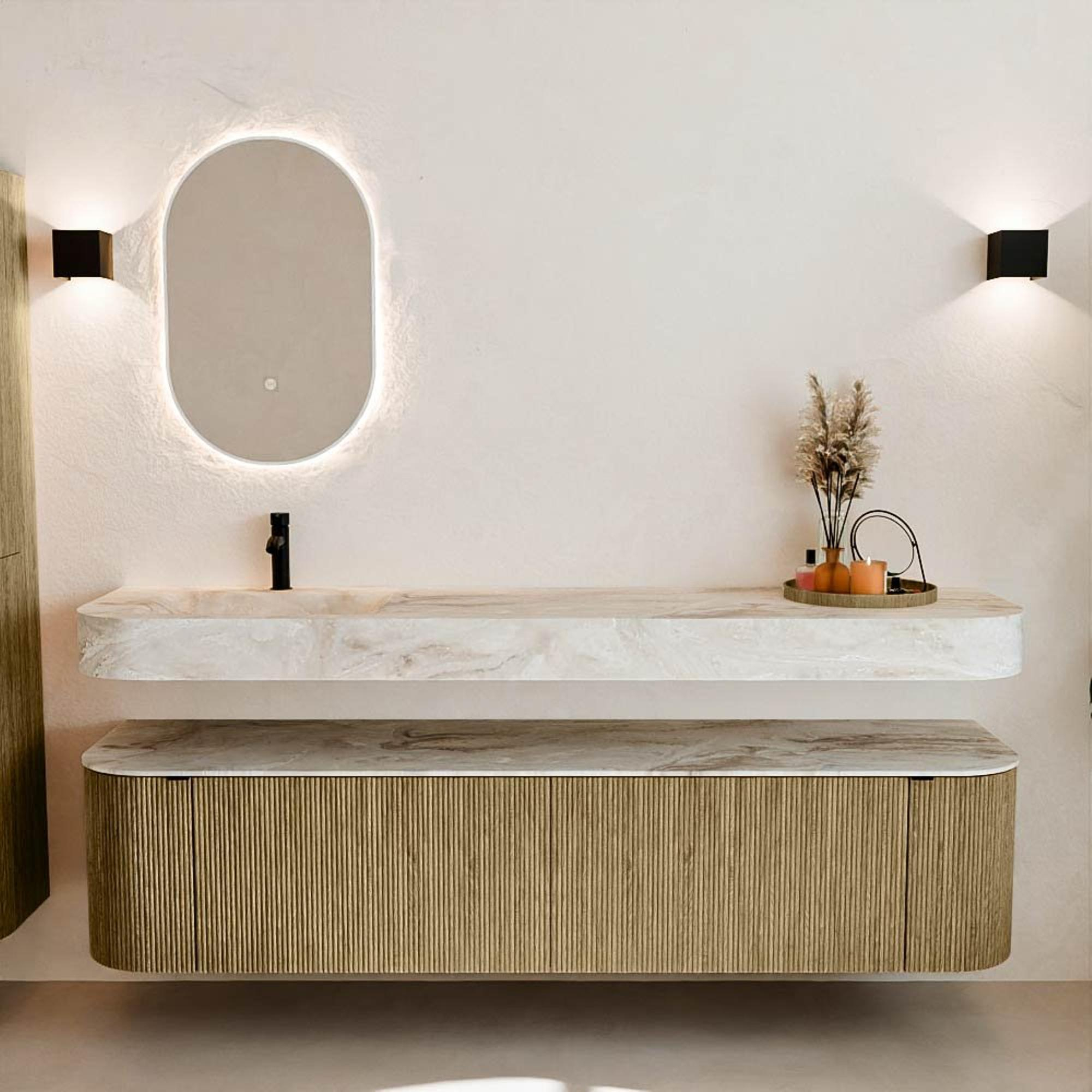 Matériaux naturels dans des tons chauds. Les cannelures verticales apportent rythme et texture au design, tandis que le chêne confère une apparence chaleureuse et artisanale. Choisissez parmi 5 teintes de bois OAK, WALNUT, DUSK, SHADOW et RUBY, des couleurs de bois soigneusement sélectionnées pour enrichir les salles de bains modernes et classiques.