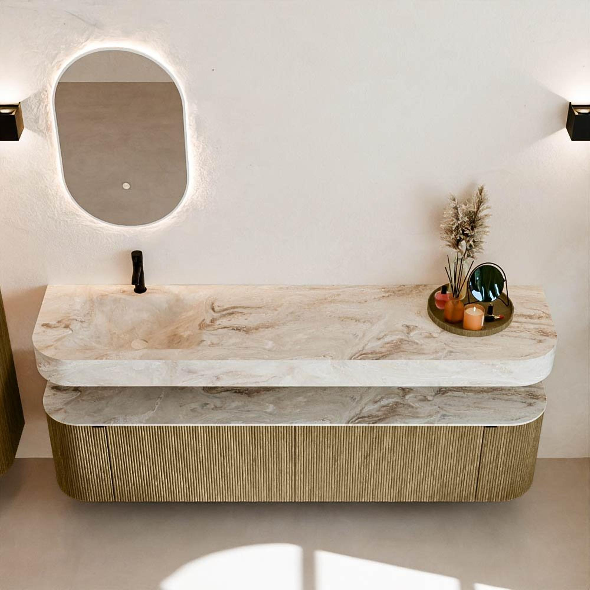 Au-dessus du meuble flotte une vasque suspendue assortie aux coins arrondis – parfaitement adaptée à la forme du meuble. La vasque est en Solid Surface et suit subtilement les lignes du meuble sous-jacent, créant un ensemble harmonieux. Le plan de travail en Solid Surface constitue une base solide, facile d’entretien et complète la combinaison.