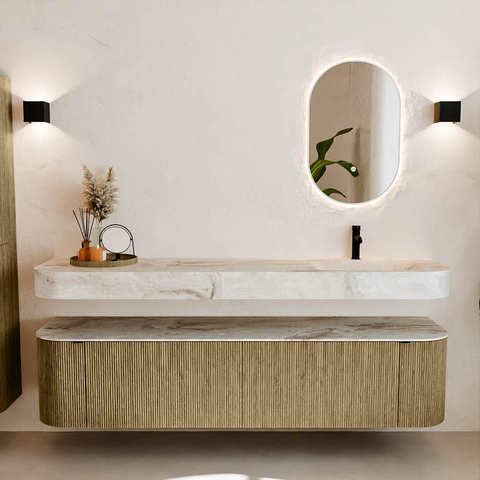 Matériaux naturels dans des tons chauds. Les nervures verticales apportent rythme et texture au design, tandis que le chêne confère une apparence chaleureuse et artisanale. Choisissez parmi 5 teintes de bois OAK, WALNUT, DUSK, SHADOW et RUBY, des couleurs de bois soigneusement sélectionnées pour enrichir les salles de bains modernes et classiques.