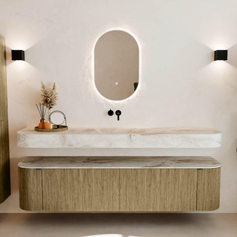 Matériaux naturels dans des tons chauds. Les nervures verticales apportent rythme et texture au design, tandis que le chêne confère une apparence chaleureuse et artisanale. Choisissez parmi 5 teintes de bois OAK, WALNUT, DUSK, SHADOW et RUBY, des couleurs de bois soigneusement sélectionnées pour enrichir les salles de bains modernes et classiques.