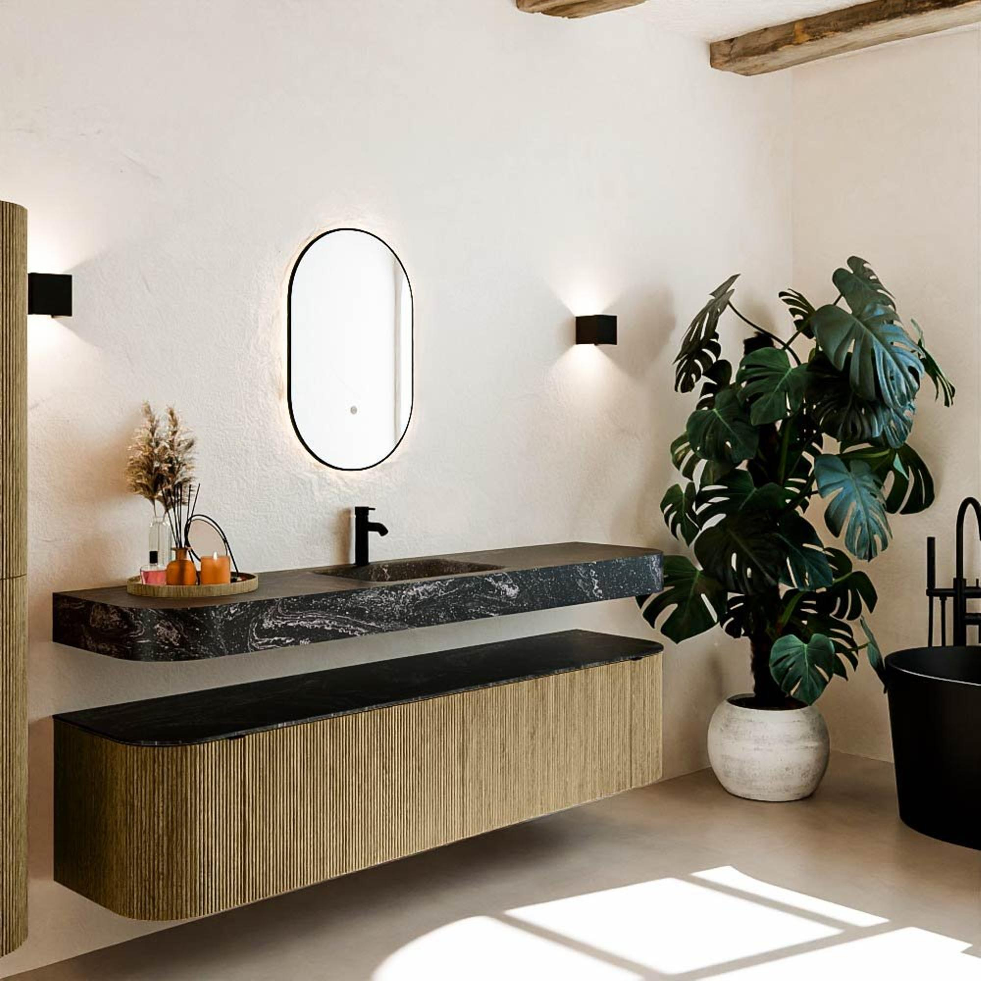 Matériaux naturels dans des tons chauds. Les nervures verticales apportent rythme et texture au design, tandis que le chêne confère une apparence chaleureuse et artisanale. Choisissez parmi 5 teintes de bois OAK, WALNUT, DUSK, SHADOW et RUBY, des couleurs de bois soigneusement sélectionnées pour enrichir les salles de bains modernes et classiques.