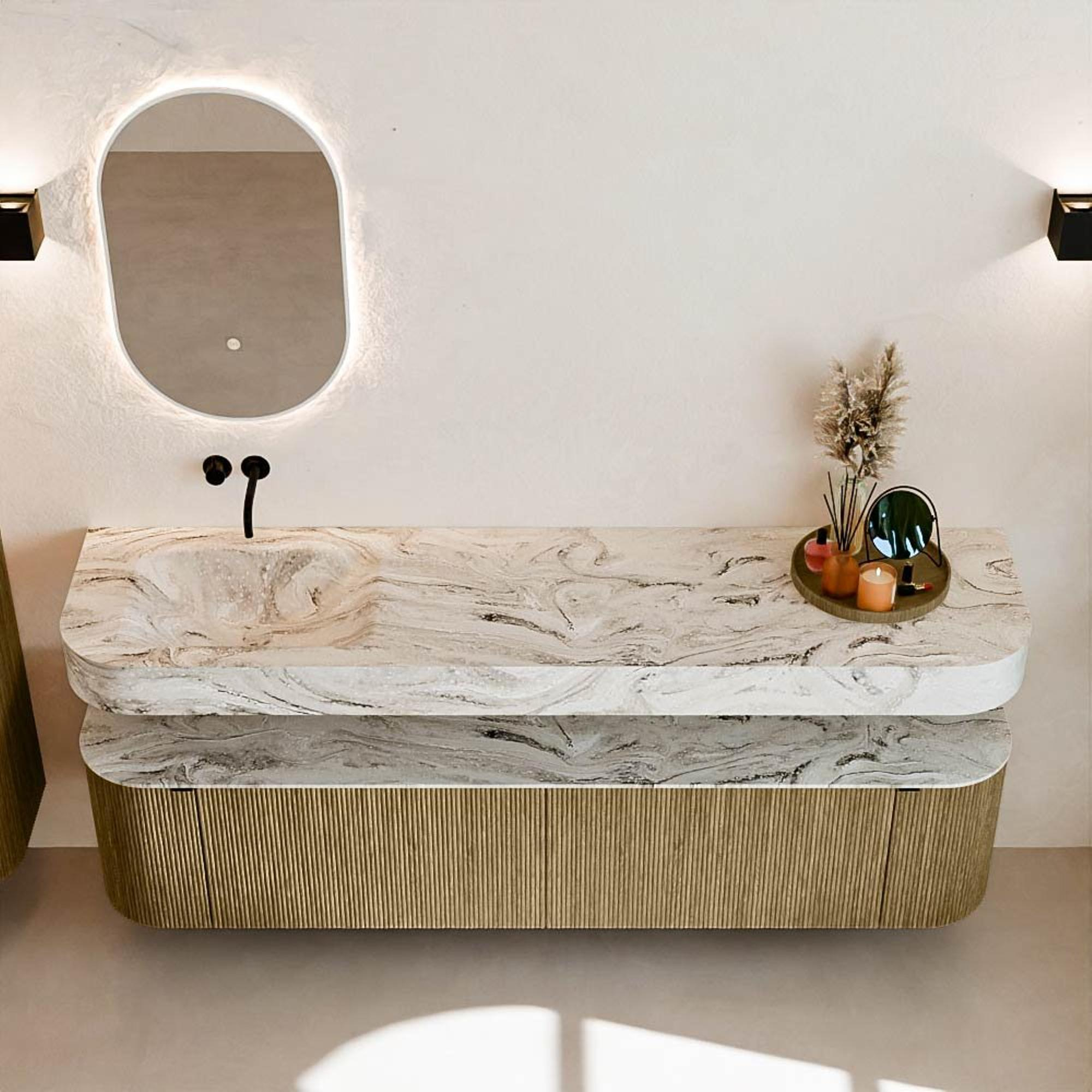 Au-dessus du meuble flotte une vasque suspendue assortie aux coins arrondis – parfaitement adaptée à la forme du meuble. La vasque est réalisée en Solid Surface et suit subtilement les lignes du meuble inférieur, créant ainsi un ensemble harmonieux. Le plan de travail en Solid Surface forme une base solide, facile d'entretien, et complète la combinaison.