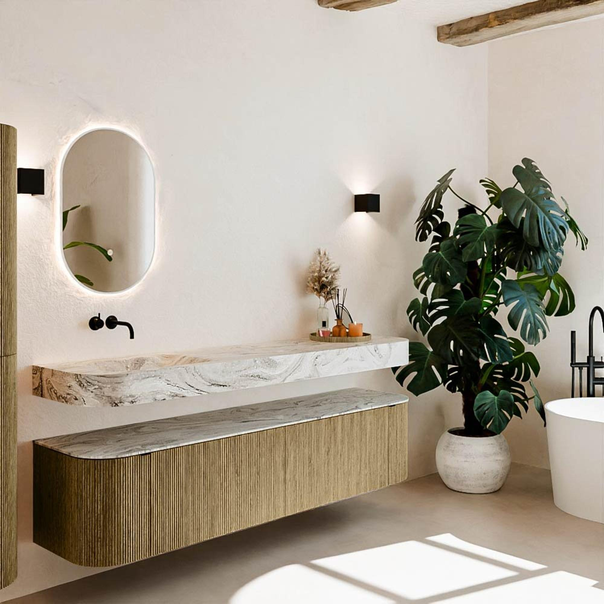 Matériaux naturels dans des tons chauds. Les nervures verticales apportent rythme et texture au design, tandis que le chêne confère une apparence chaleureuse et artisanale. Choisissez parmi 5 teintes de bois OAK, WALNUT, DUSK, SHADOW et RUBY, des couleurs de bois soigneusement sélectionnées pour enrichir les salles de bains modernes et classiques.