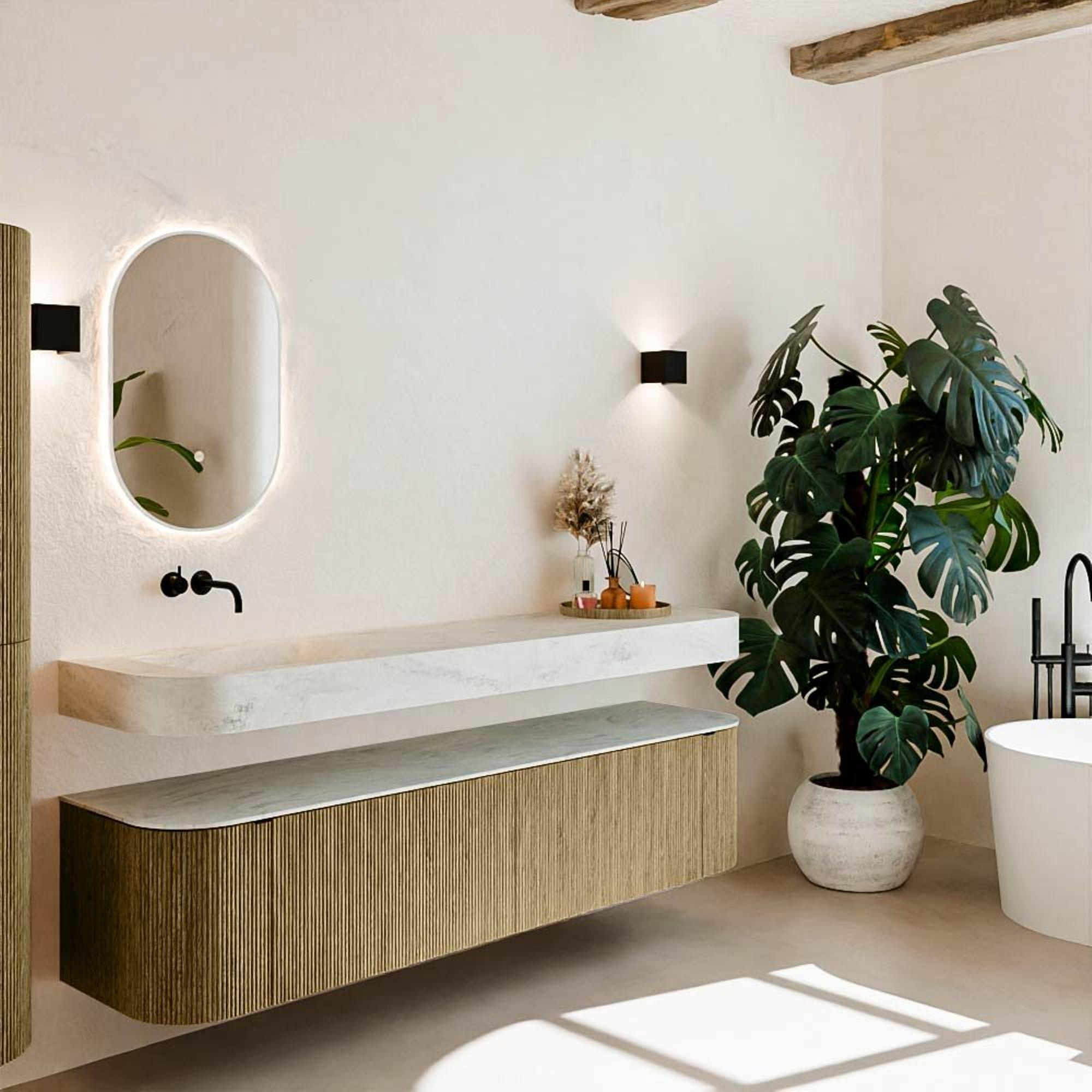 Matériaux naturels dans des tons chauds. Les nervures verticales apportent rythme et texture au design, tandis que le chêne confère une apparence chaleureuse et artisanale. Choisissez parmi 5 teintes de bois OAK, WALNUT, DUSK, SHADOW et RUBY, des couleurs de bois soigneusement sélectionnées pour enrichir les salles de bains modernes et classiques.