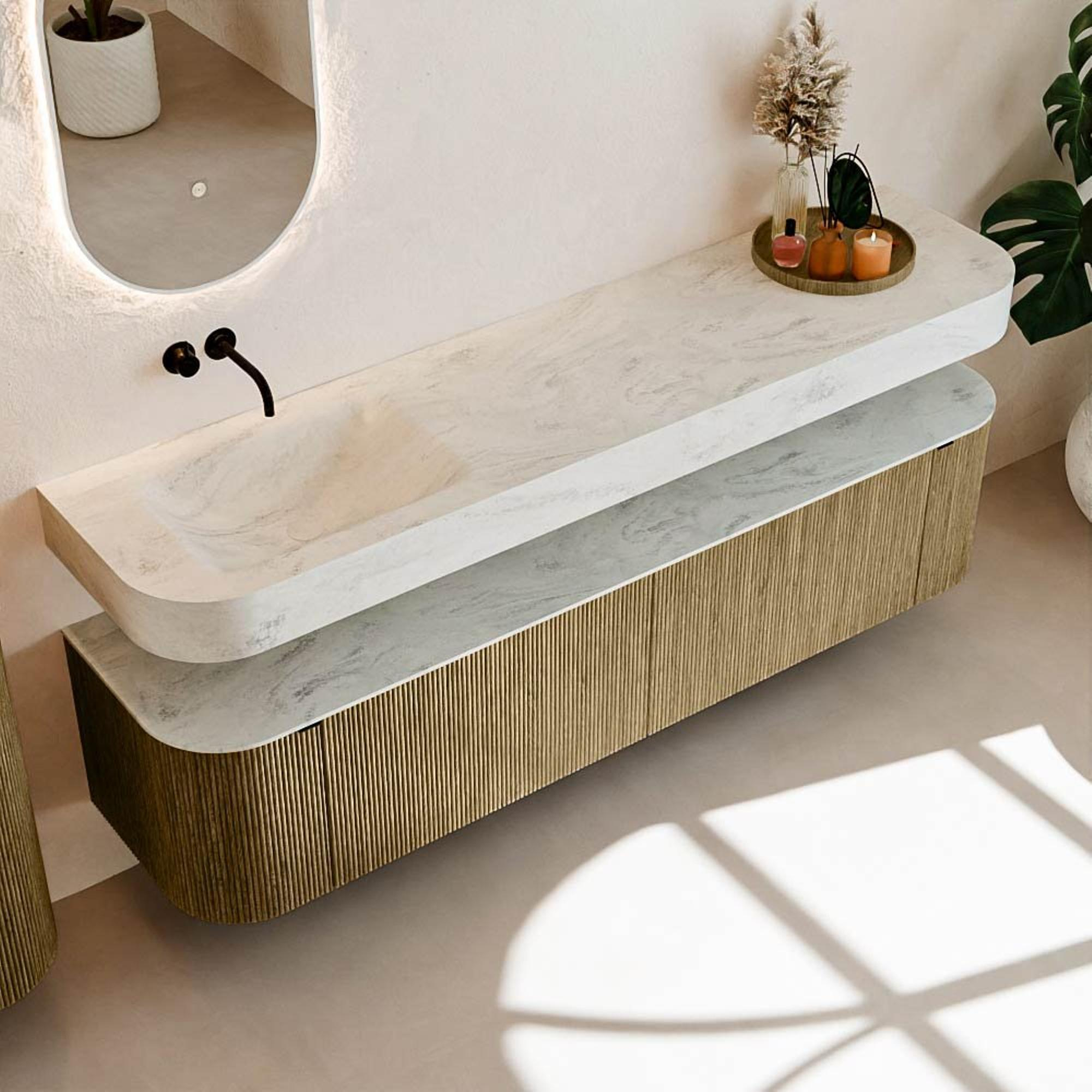 Au-dessus du meuble flotte une vasque suspendue assortie aux coins arrondis – parfaitement adaptée à la forme du meuble. La vasque est réalisée en Solid Surface et suit subtilement les lignes du meuble inférieur, créant ainsi un ensemble harmonieux. Le plan de travail en Solid Surface forme une base solide, facile d'entretien, complétant la combinaison.