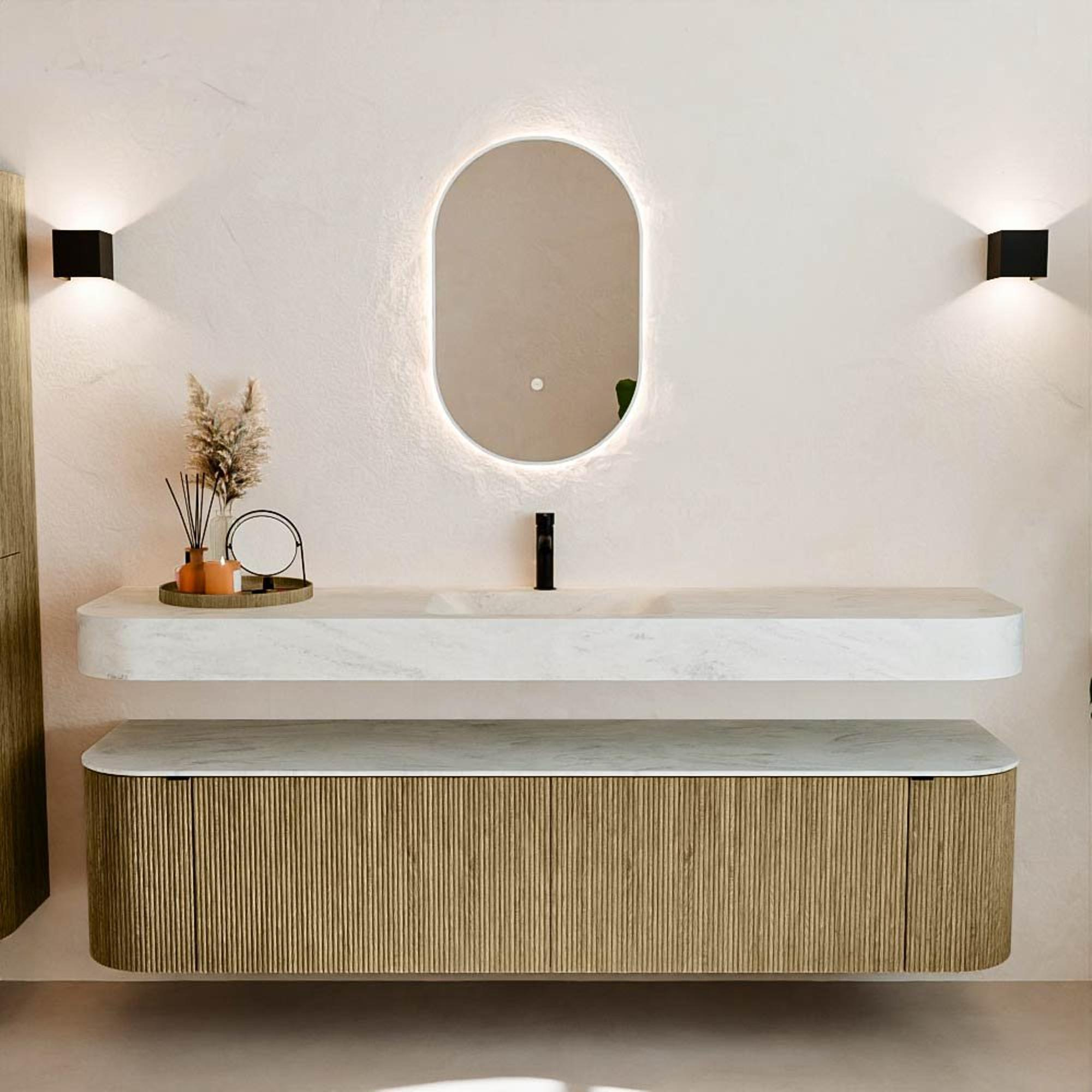 Matériaux naturels dans des tons chauds. Les nervures verticales apportent rythme et texture au design, tandis que le chêne confère une apparence chaleureuse et artisanale. Choisissez parmi 5 teintes de bois OAK, WALNUT, DUSK, SHADOW et RUBY, des couleurs de bois soigneusement sélectionnées pour enrichir les salles de bains modernes et classiques.