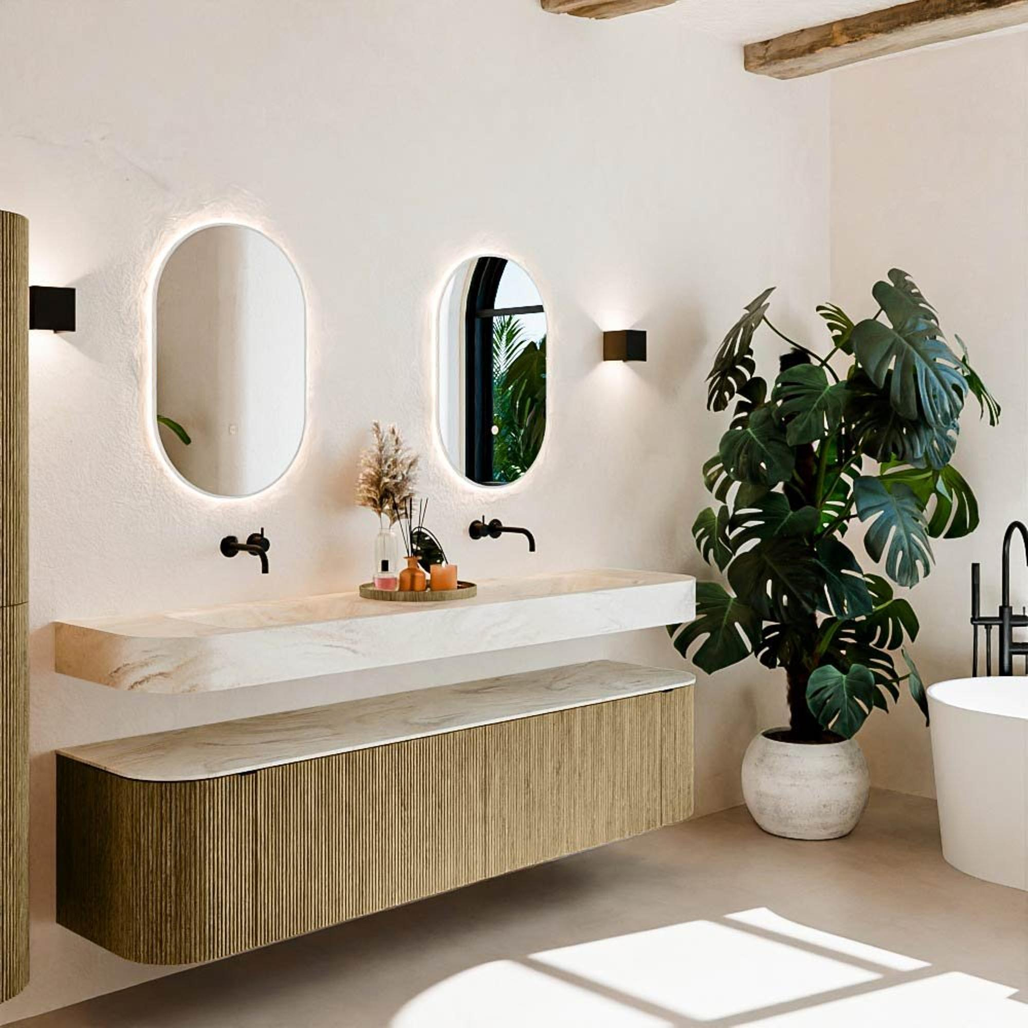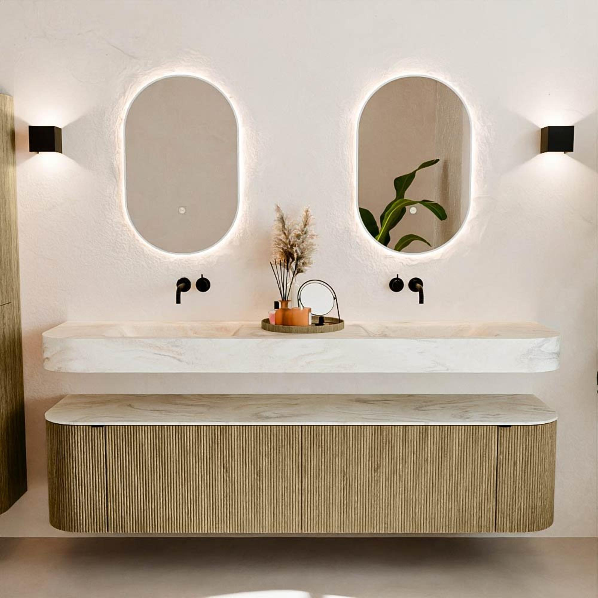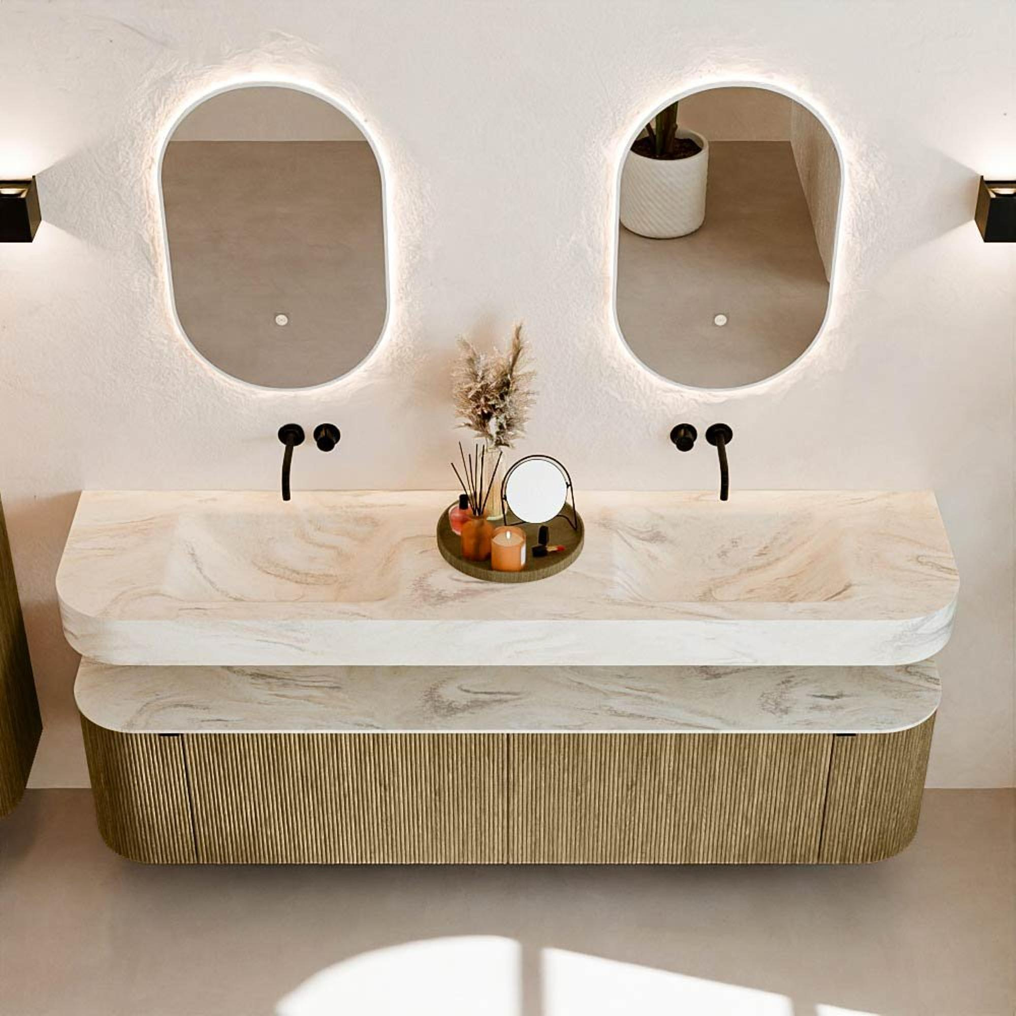 Matériaux naturels aux teintes chaudes. Les nervures verticales apportent rythme et texture au design, tandis que le chêne confère une apparence chaleureuse et artisanale. Choisissez parmi 5 teintes de bois OAK, WALNUT, DUSK, SHADOW et RUBY, des couleurs de bois soigneusement sélectionnées pour enrichir les salles de bains modernes et classiques.