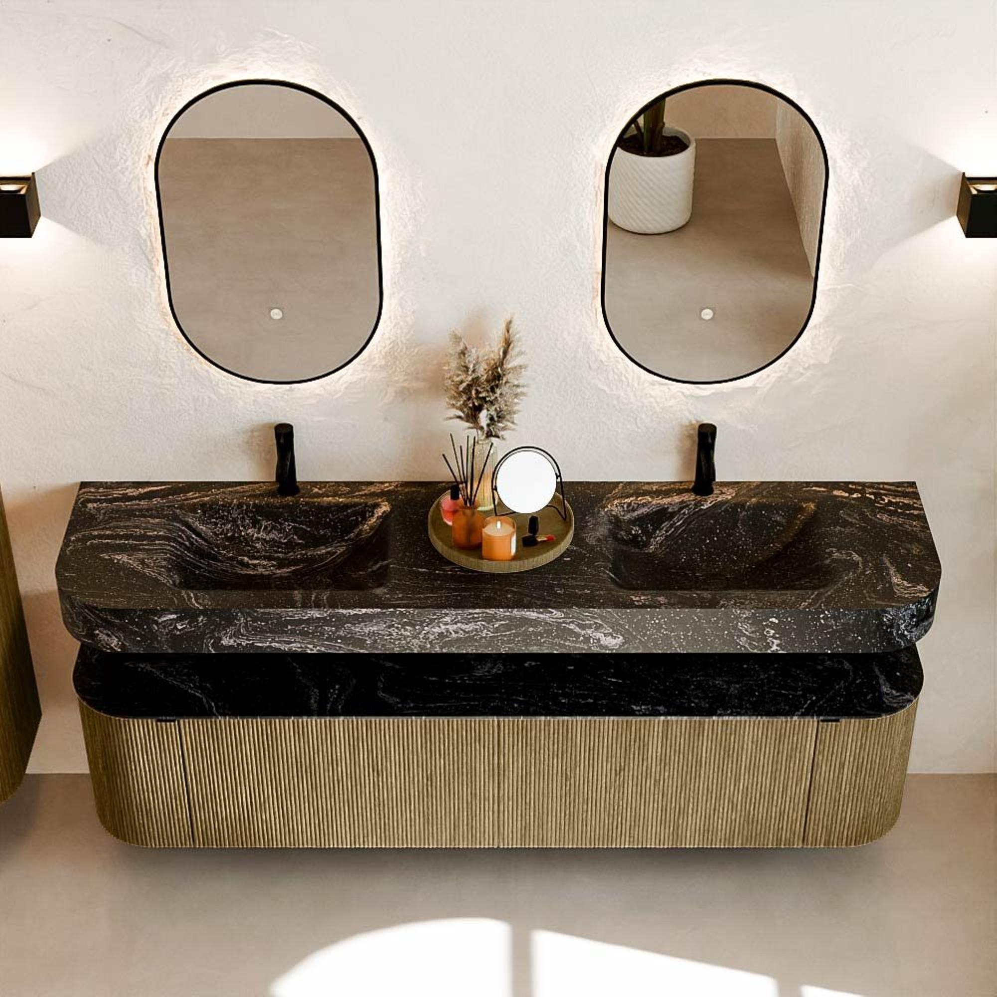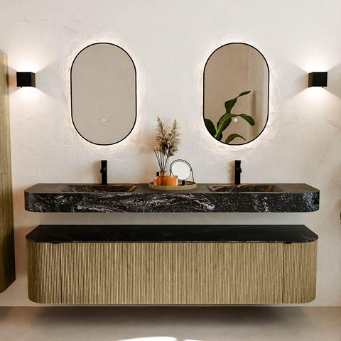 Matériaux naturels aux teintes chaudes. Les reliefs verticaux apportent rythme et texture au design, tandis que le chêne confère une apparence chaleureuse et artisanale. Choisissez parmi 5 teintes de bois OAK, WALNUT, DUSK, SHADOW et RUBY, des couleurs de bois soigneusement sélectionnées pour enrichir les salles de bains modernes et classiques.