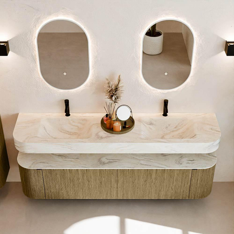 Matériaux naturels dans des tons chauds. Les nervures verticales apportent rythme et texture au design, tandis que le chêne confère une apparence chaleureuse et artisanale. Choisissez parmi 5 teintes de bois OAK, WALNUT, DUSK, SHADOW et RUBY, des couleurs de bois soigneusement sélectionnées pour enrichir les salles de bains modernes et classiques.