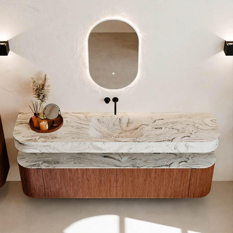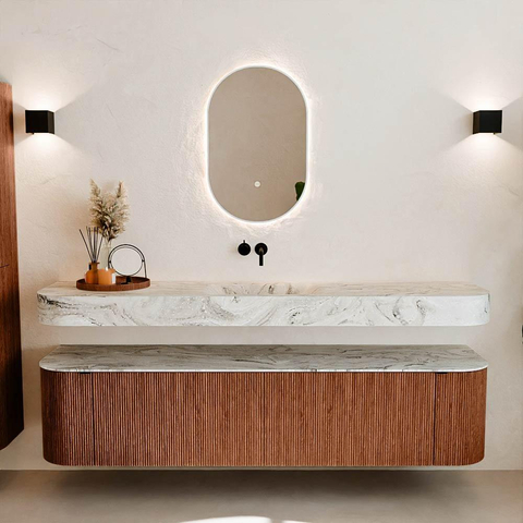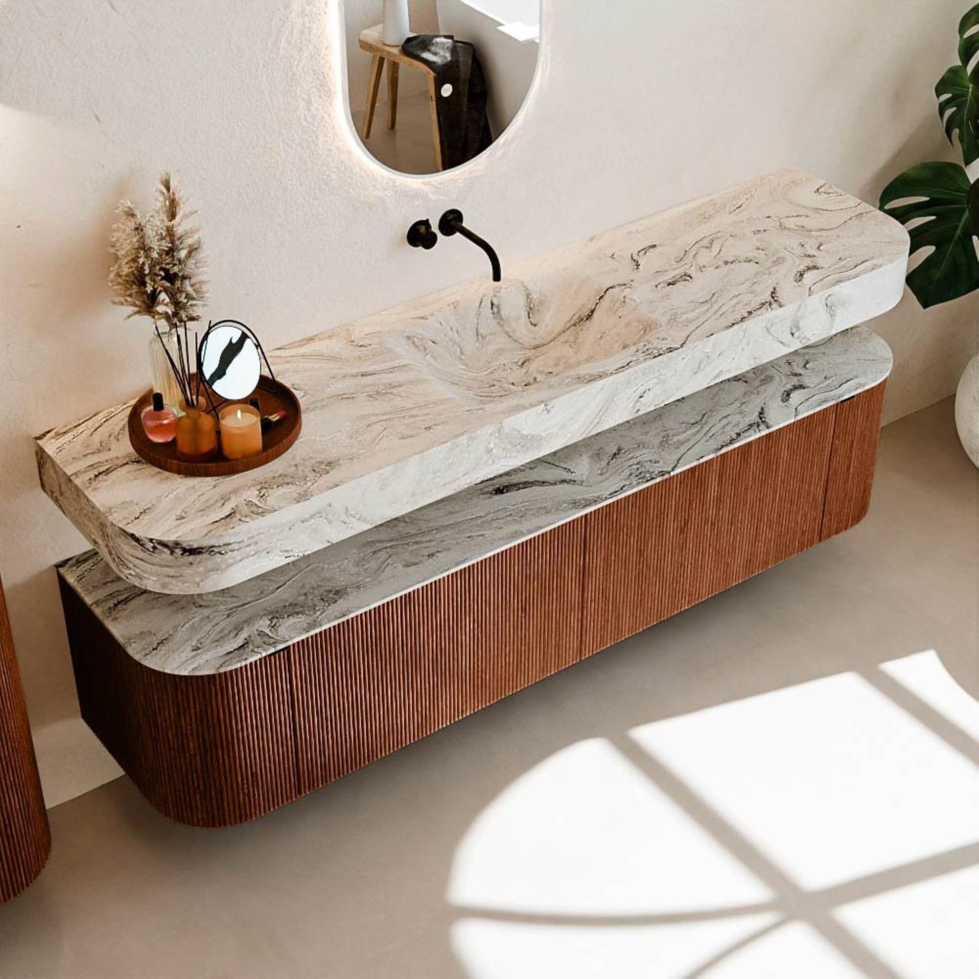 Au-dessus du meuble flotte une vasque suspendue assortie aux coins arrondis – parfaitement adaptée à la forme du meuble. La vasque est réalisée en Solid Surface et suit subtilement les lignes du meuble inférieur, créant ainsi un ensemble harmonieux. Le plan de travail en Solid Surface forme une base solide et facile d'entretien et complète la combinaison.
