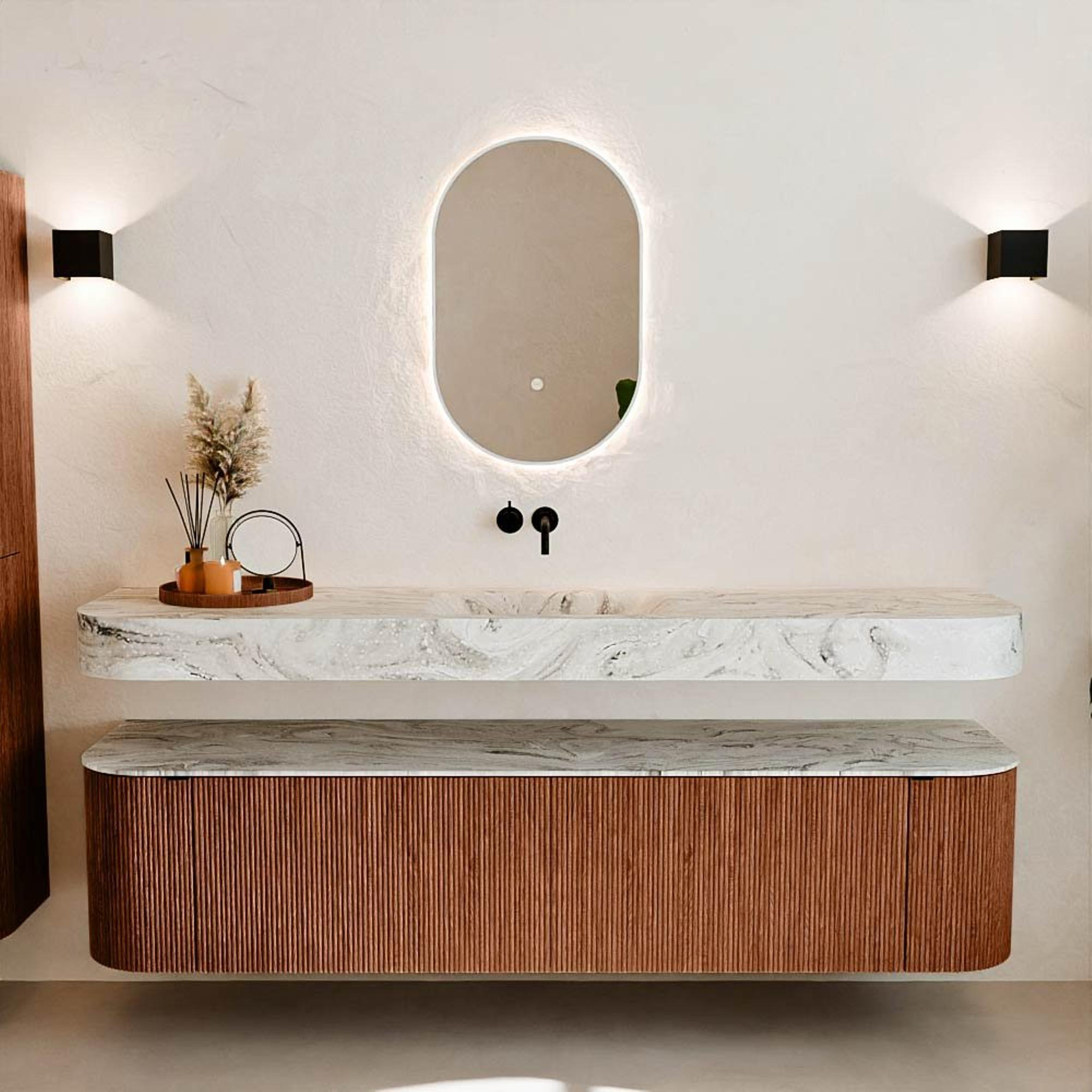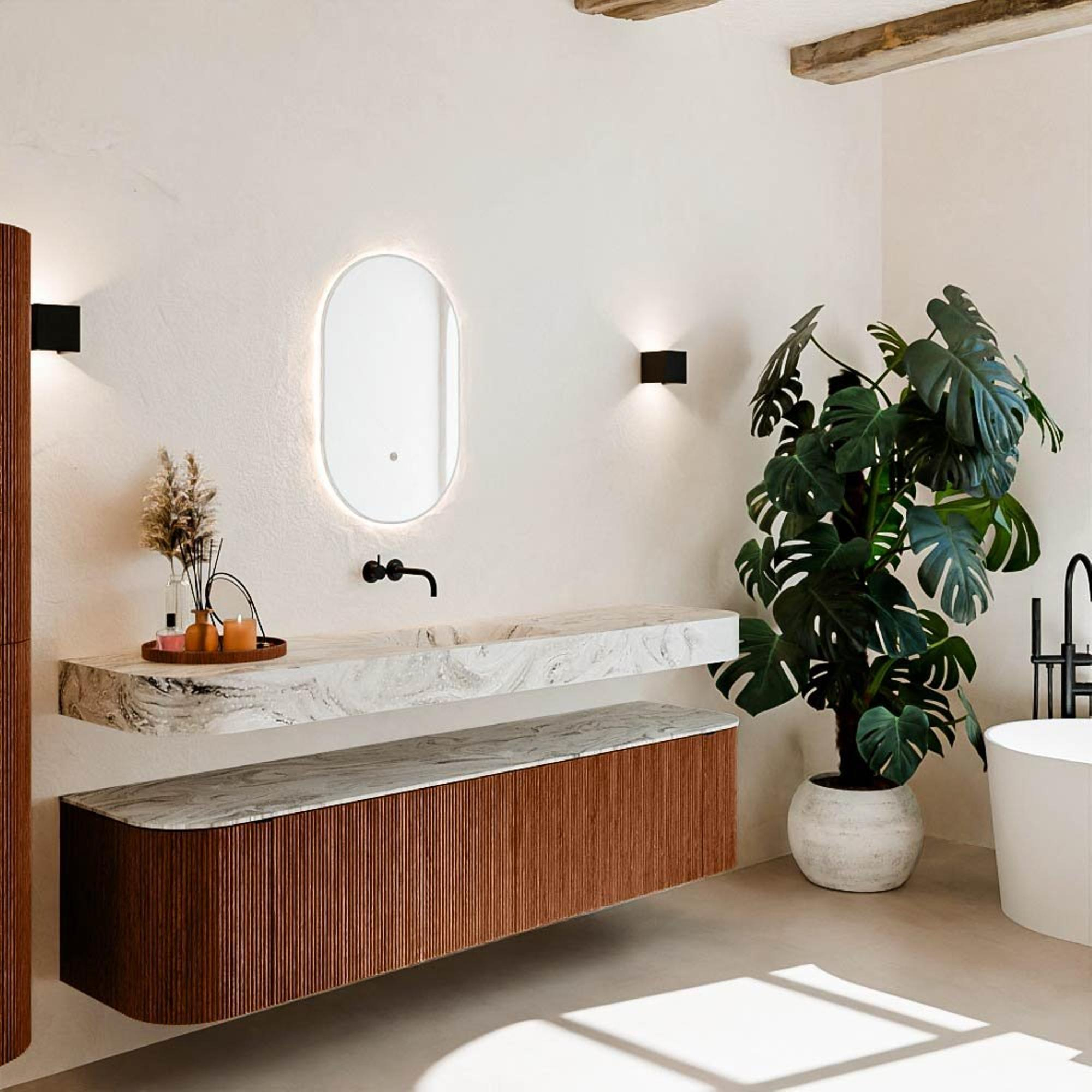 Matériaux naturels dans des tons chauds. Les nervures verticales apportent rythme et texture au design, tandis que le chêne confère une apparence chaleureuse et artisanale. Choisissez parmi 5 teintes de bois OAK, WALNUT, DUSK, SHADOW et RUBY, des couleurs de bois soigneusement sélectionnées pour enrichir les salles de bains modernes et classiques.