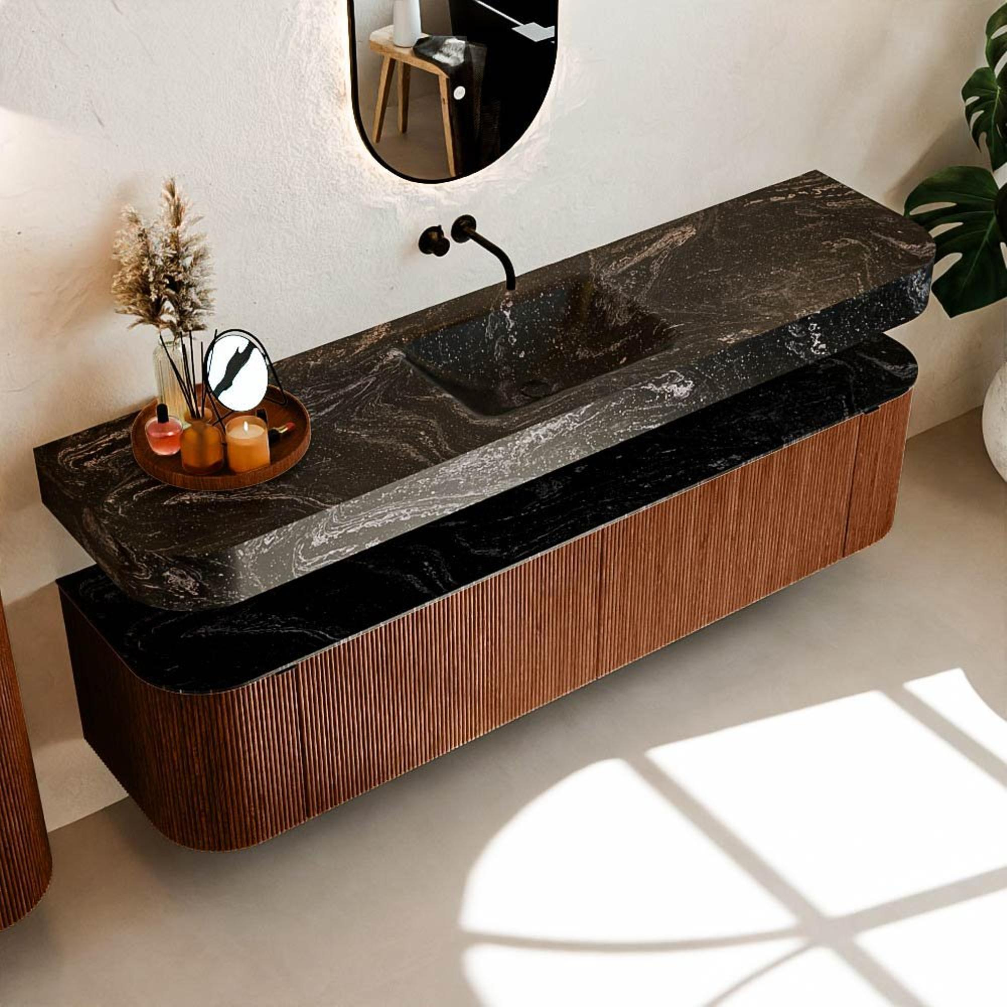 Matériaux naturels dans des tons chauds. Les nervures verticales apportent rythme et texture au design, tandis que le chêne confère une apparence chaleureuse et artisanale. Choisissez parmi 5 teintes de bois OAK, WALNUT, DUSK, SHADOW et RUBY, des couleurs de bois soigneusement sélectionnées pour enrichir les salles de bains modernes et classiques.