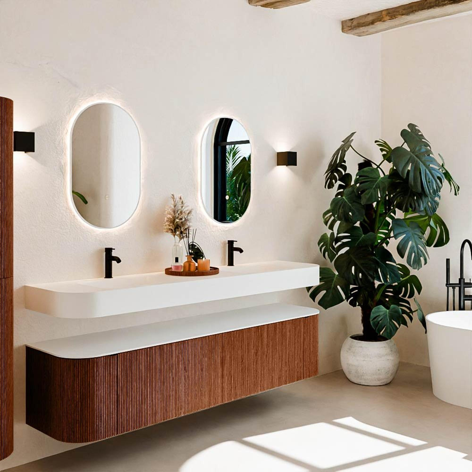Matériaux naturels dans des tons chauds. Les nervures verticales apportent rythme et texture au design, tandis que le chêne confère une apparence chaleureuse et artisanale. Choisissez parmi 5 teintes de bois OAK, WALNUT, DUSK, SHADOW et RUBY, des couleurs de bois soigneusement sélectionnées pour enrichir les salles de bains modernes et classiques.