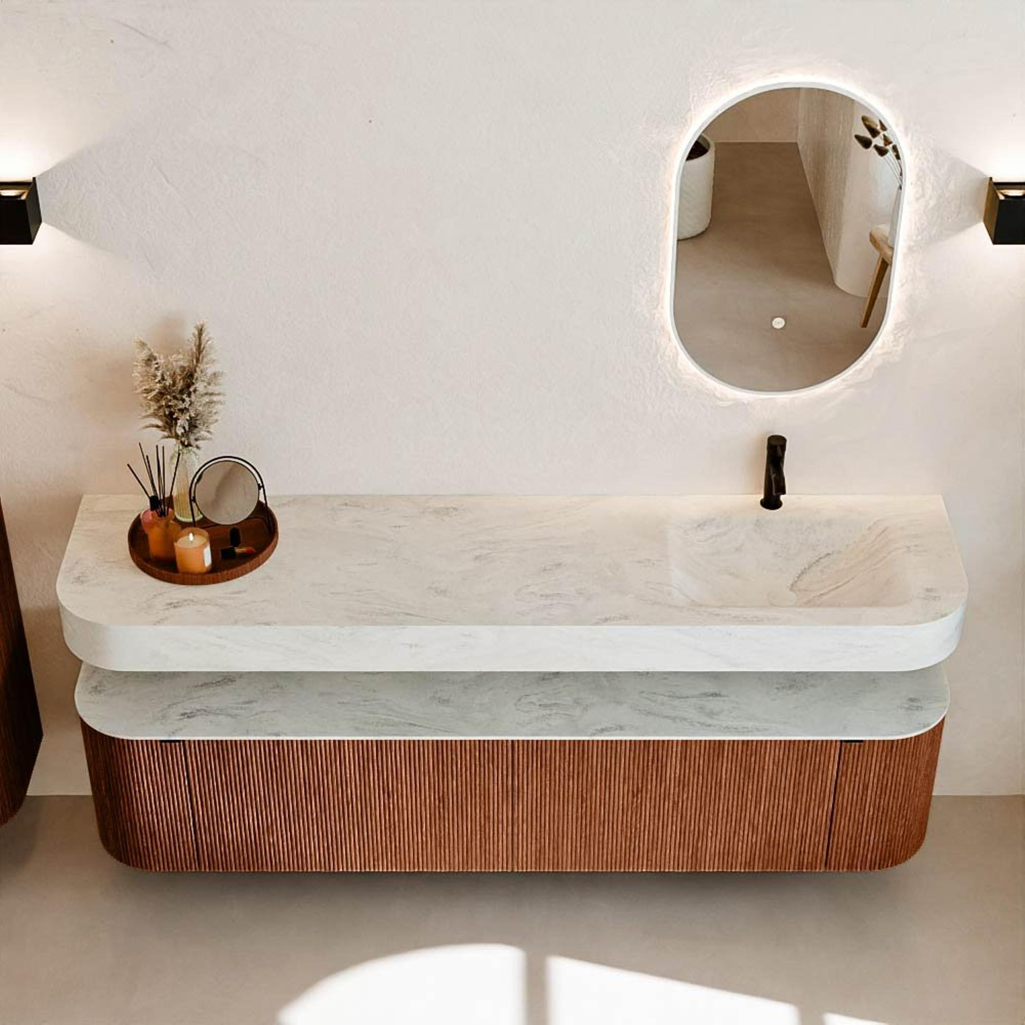 Au-dessus du meuble flotte une vasque suspendue assortie aux coins arrondis – parfaitement adaptée à la forme du meuble. La vasque est réalisée en Solid Surface et suit subtilement les lignes du meuble inférieur, créant ainsi un ensemble harmonieux. Le plan de travail en Solid Surface forme une base solide, facile d'entretien, et complète la combinaison.