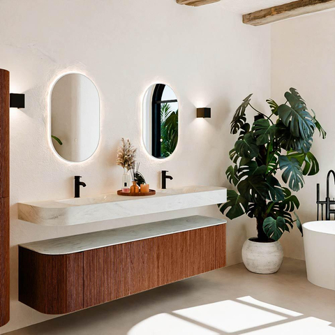Matériaux naturels dans des tons chauds. Les nervures verticales apportent rythme et texture au design, tandis que le chêne confère une apparence chaleureuse et artisanale. Choisissez parmi 5 teintes de bois OAK, WALNUT, DUSK, SHADOW et RUBY, des couleurs de bois soigneusement sélectionnées pour enrichir les salles de bains modernes et classiques.