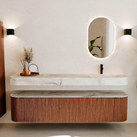 Au-dessus du meuble flotte une vasque suspendue assortie aux coins arrondis – parfaitement adaptée à la forme du meuble. La vasque est réalisée en Solid Surface et suit subtilement les lignes du meuble inférieur, créant ainsi un ensemble harmonieux. Le plan de travail en Solid Surface forme une base solide, facile d'entretien, complétant la combinaison.