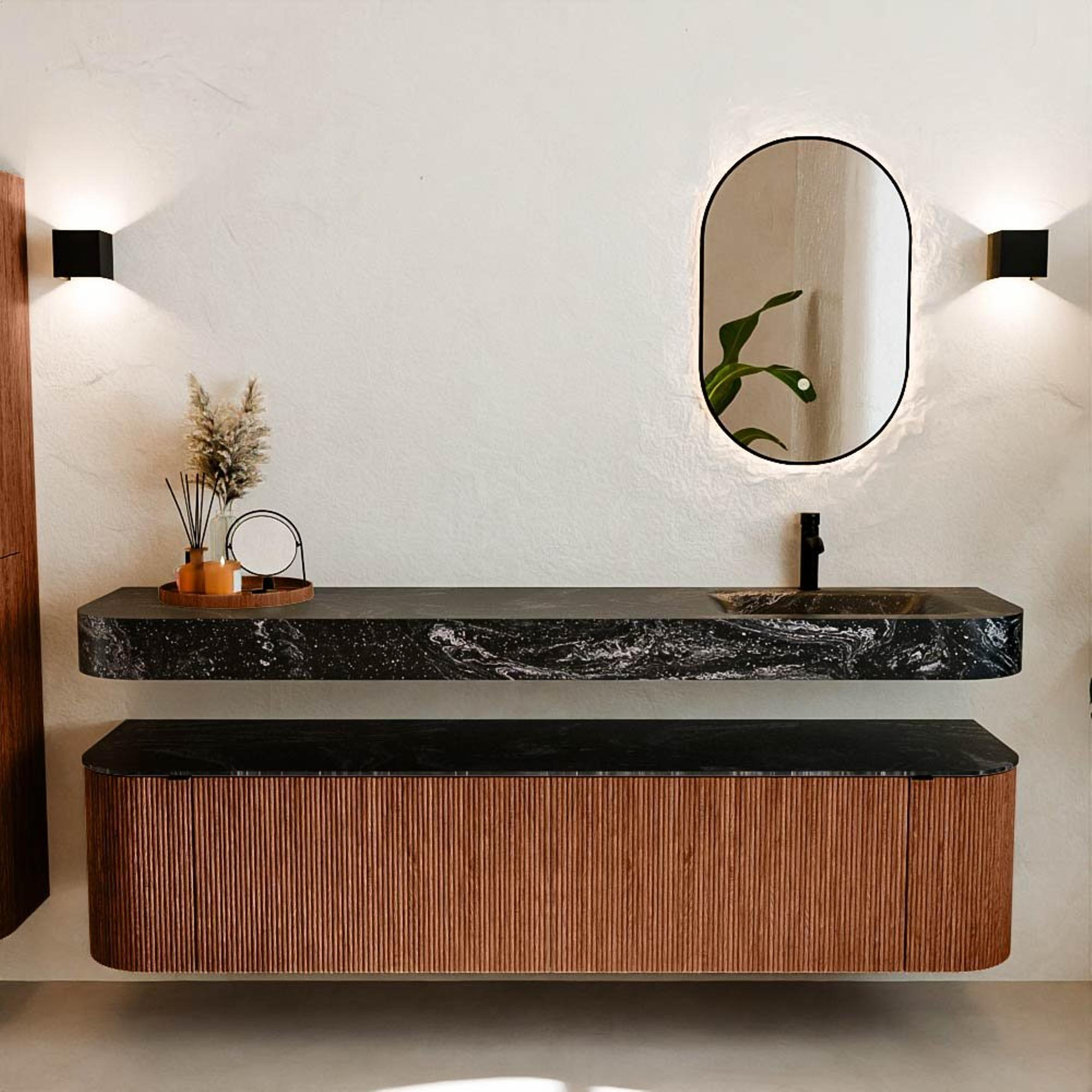 Matériaux naturels dans des tons chauds. Les rainures verticales apportent rythme et texture au design, tandis que le chêne confère une apparence chaleureuse et artisanale. Choisissez parmi 5 teintes de bois OAK, WALNUT, DUSK, SHADOW et RUBY, des couleurs de bois soigneusement sélectionnées pour enrichir les salles de bains modernes et classiques.