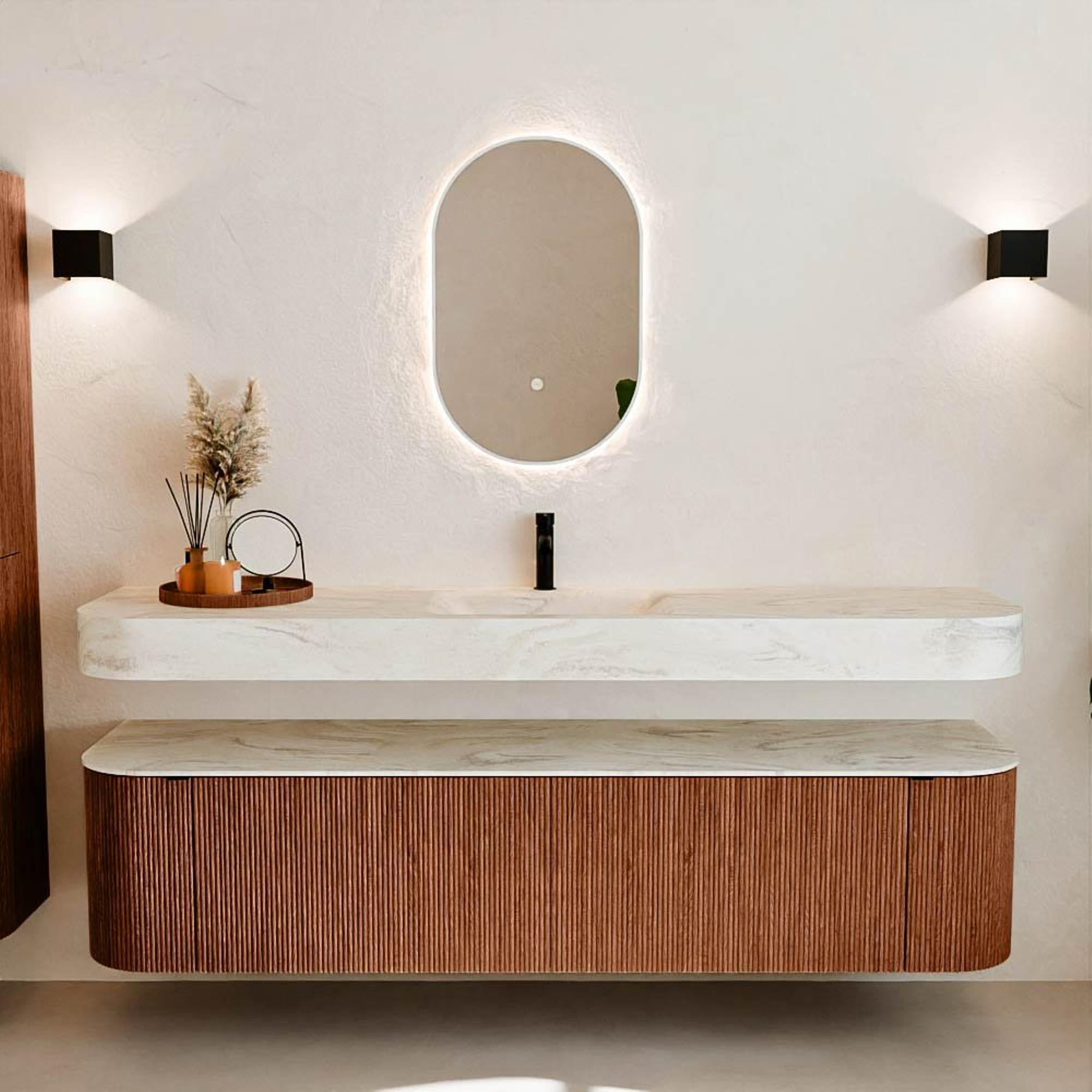 Au-dessus du meuble flotte une vasque suspendue assortie aux coins arrondis – parfaitement adaptée à la forme du meuble. La vasque est réalisée en Solid Surface et suit subtilement les lignes du meuble inférieur, créant ainsi un ensemble harmonieux. Le plan de travail en Solid Surface forme une base solide, facile d'entretien et complète la combinaison.