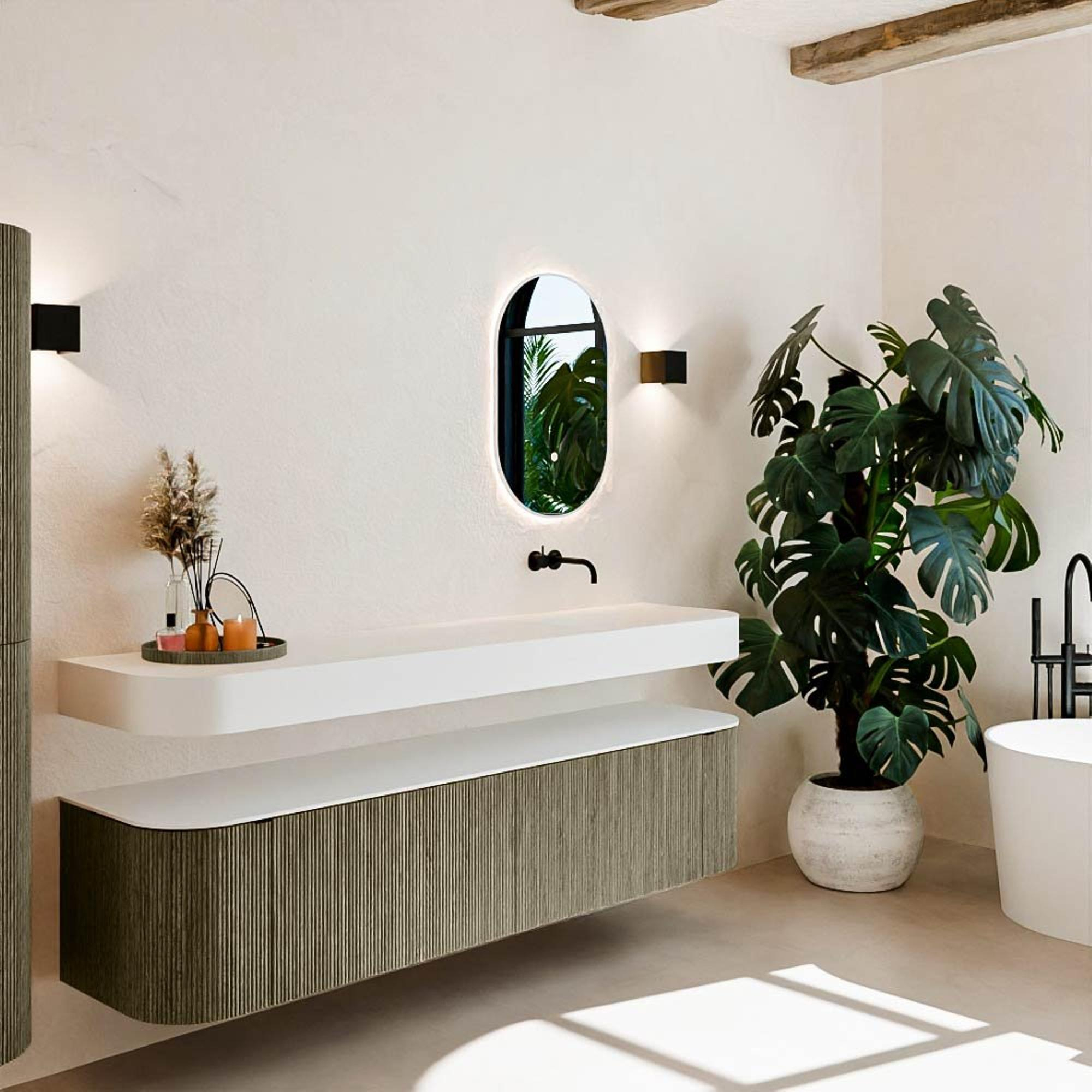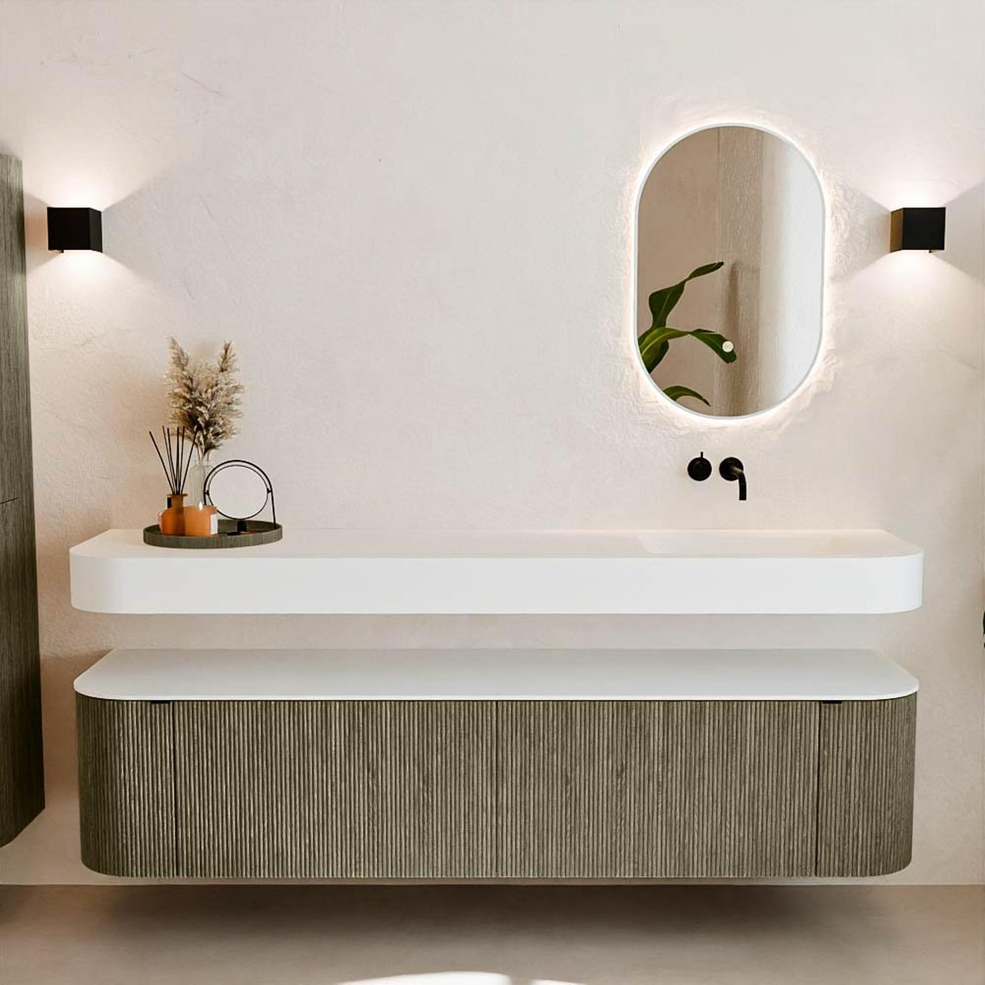 Au-dessus du meuble flotte une vasque suspendue assortie aux coins arrondis – parfaitement adaptée à la forme du meuble. La vasque est en Solid Surface et suit subtilement les lignes du meuble inférieur, créant une harmonie parfaite. Le plan de travail en Solid Surface constitue une base solide et facile d'entretien, complétant l'ensemble.