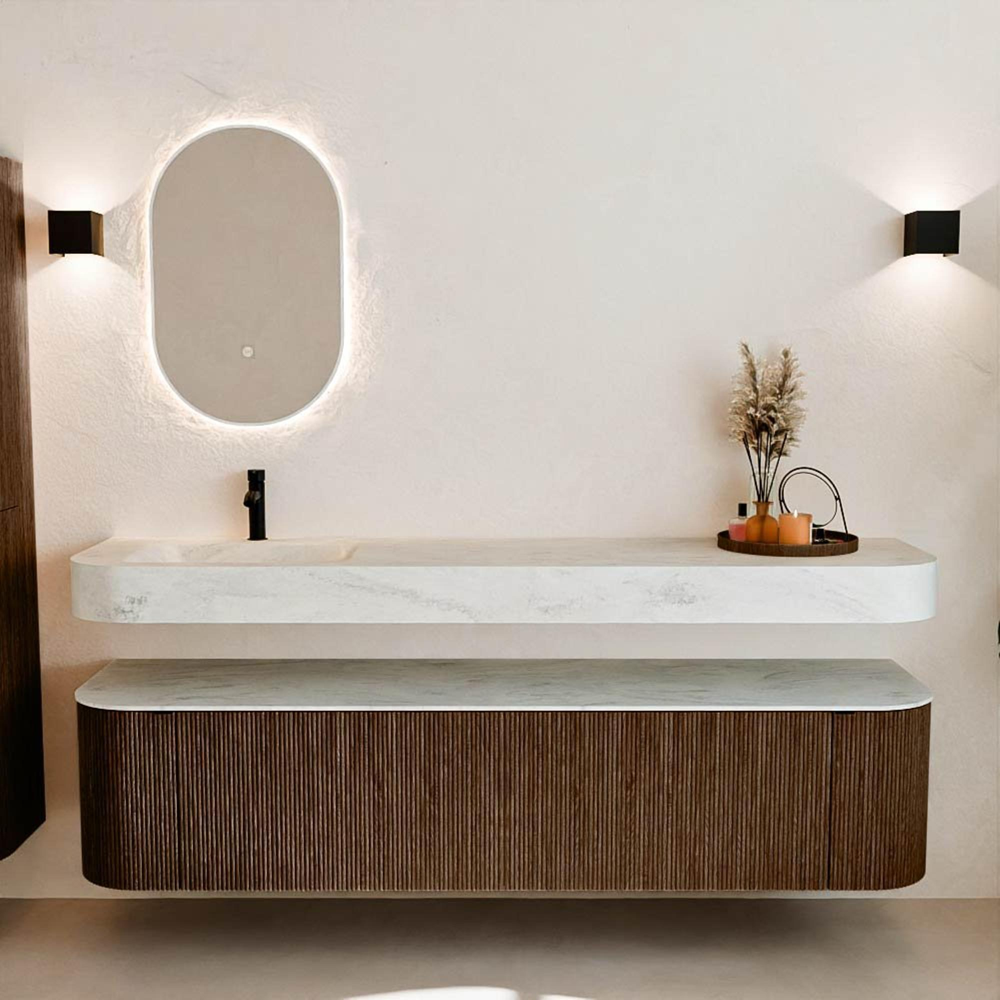 Au-dessus du meuble flotte une vasque suspendue assortie aux coins arrondis – parfaitement adaptée à la forme du meuble. La vasque est réalisée en Solid Surface et suit subtilement les lignes du meuble inférieur, créant ainsi un ensemble harmonieux. Le plan de travail en Solid Surface constitue une base solide, facile d'entretien, complétant la combinaison.