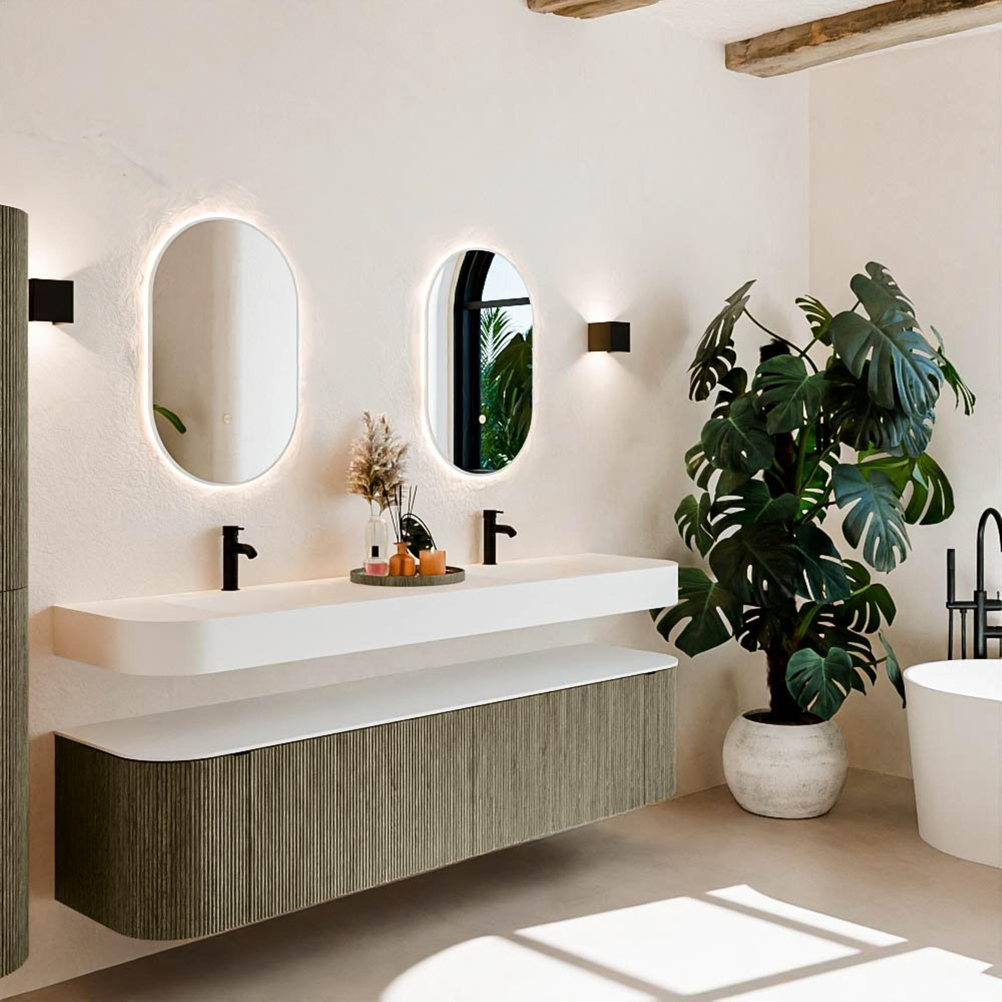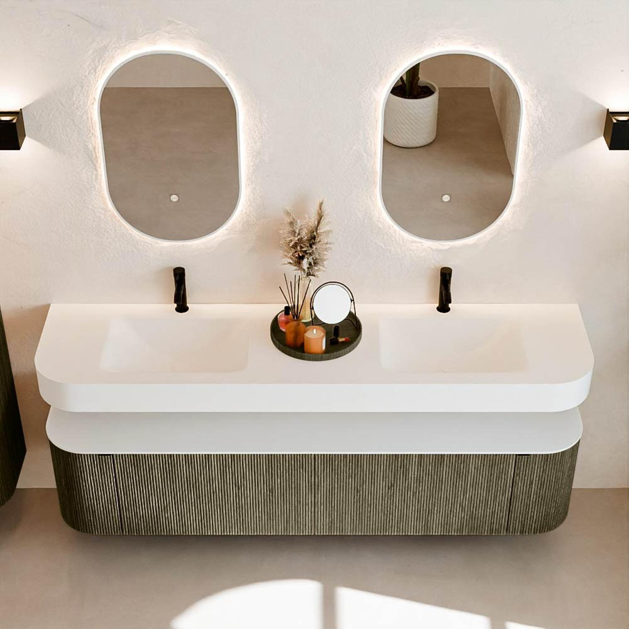 Matériaux naturels dans des tons chauds. Les nervures verticales apportent rythme et texture au design, tandis que le chêne confère une apparence chaleureuse et artisanale. Choisissez parmi 5 teintes de bois OAK, WALNUT, DUSK, SHADOW et RUBY, des couleurs de bois soigneusement sélectionnées pour enrichir les salles de bains modernes et classiques.