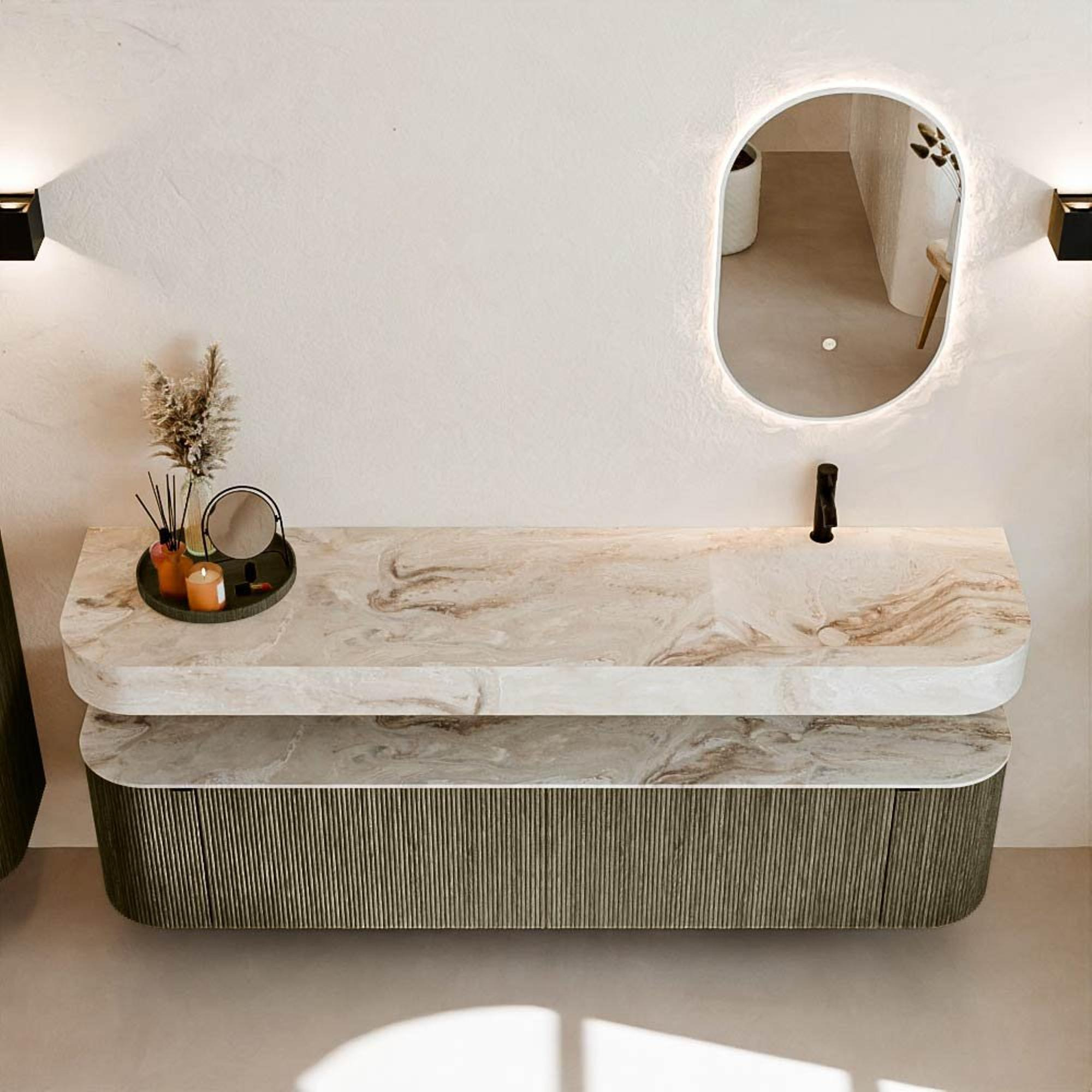 Au-dessus du meuble flotte une vasque suspendue assortie aux coins arrondis – parfaitement adaptée à la forme du meuble. La vasque est réalisée en Solid Surface et suit subtilement les lignes du meuble inférieur, créant ainsi un ensemble harmonieux. Le plan de travail en Solid Surface forme une base solide, facile d'entretien et complète la combinaison.