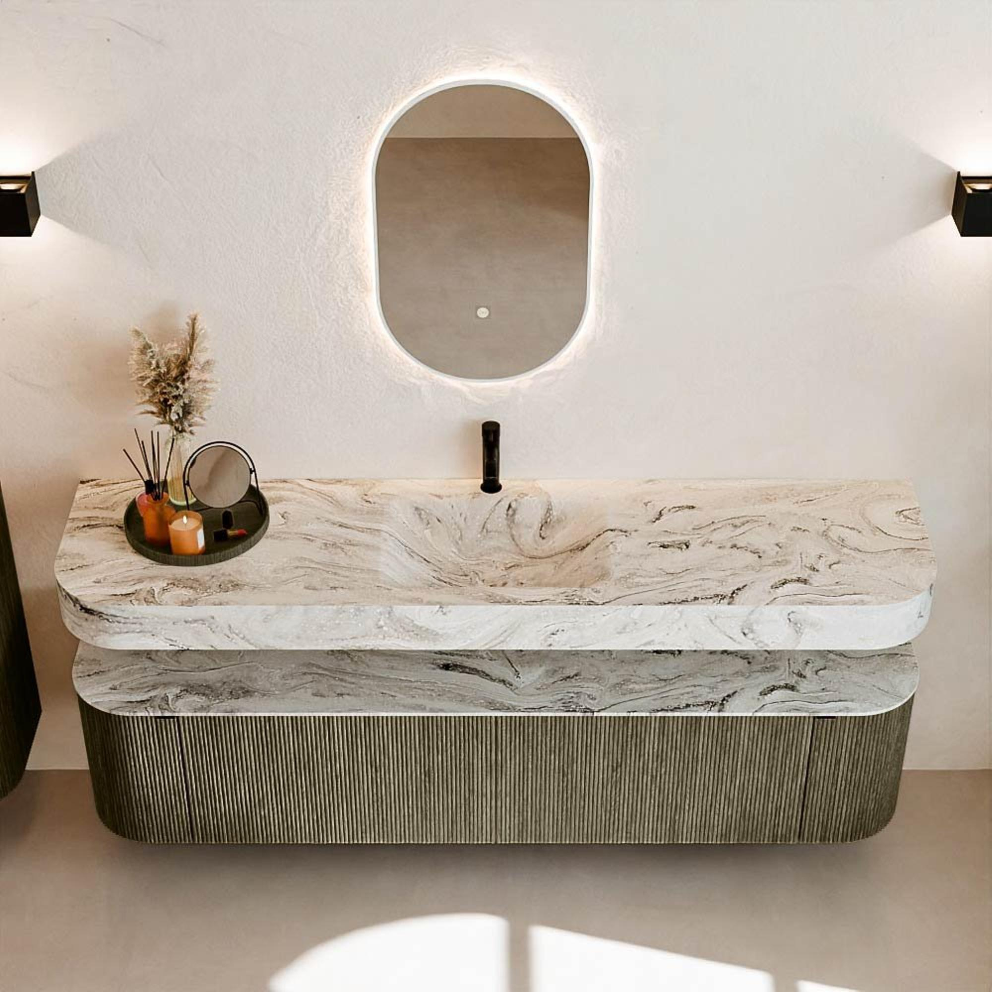 Au-dessus du meuble flotte une vasque suspendue assortie aux coins arrondis – parfaitement adaptée à la forme du meuble. La vasque est réalisée en Solid Surface et suit subtilement les lignes du meuble inférieur, créant ainsi un ensemble harmonieux. Le plan de travail en Solid Surface forme une base solide et facile d'entretien et complète la combinaison.