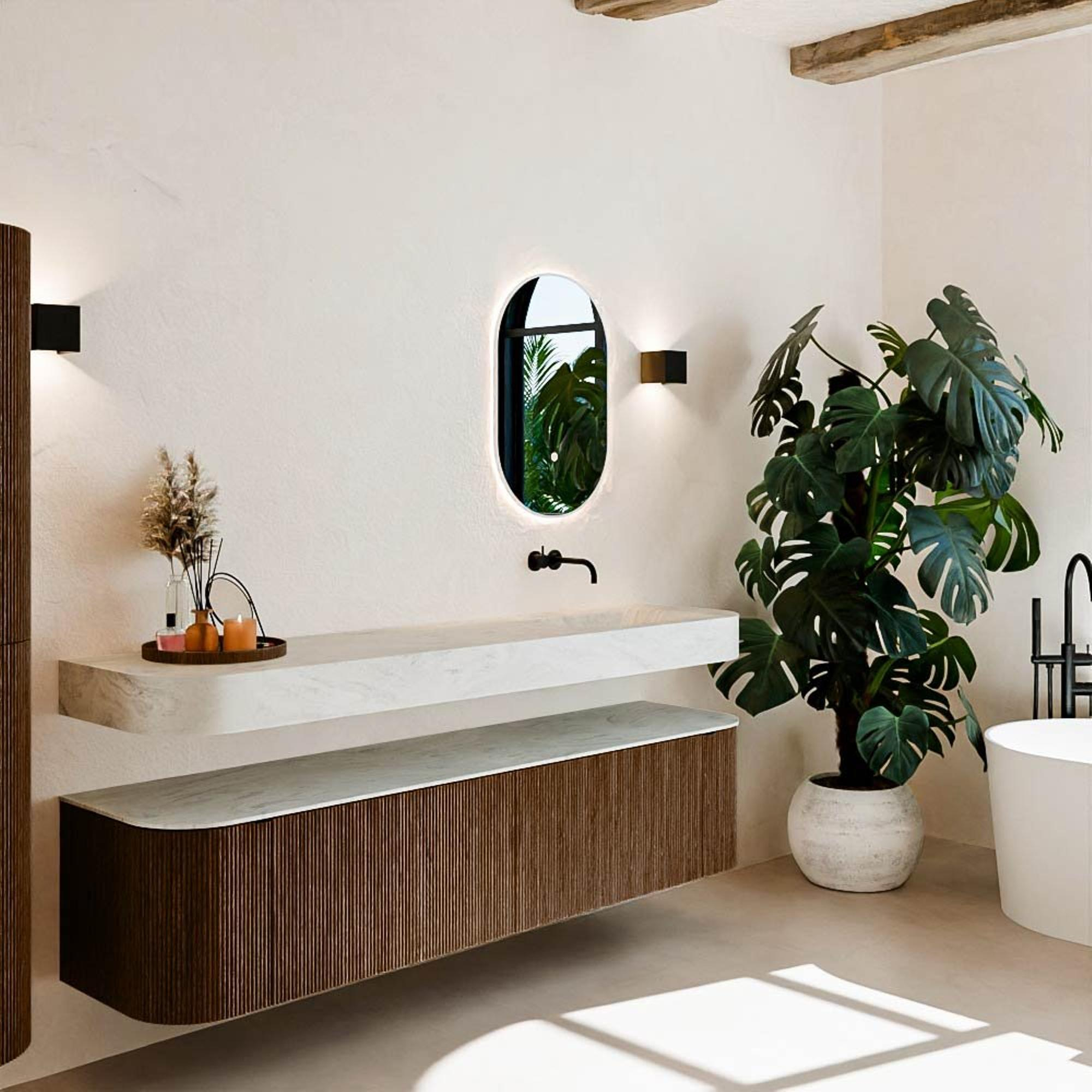 Matériaux naturels aux teintes chaudes. Les nervures verticales apportent rythme et texture au design, tandis que le chêne confère une apparence chaleureuse et artisanale. Choisissez parmi 5 teintes de bois OAK, WALNUT, DUSK, SHADOW et RUBY, des couleurs de bois soigneusement sélectionnées pour enrichir les salles de bains modernes et classiques.