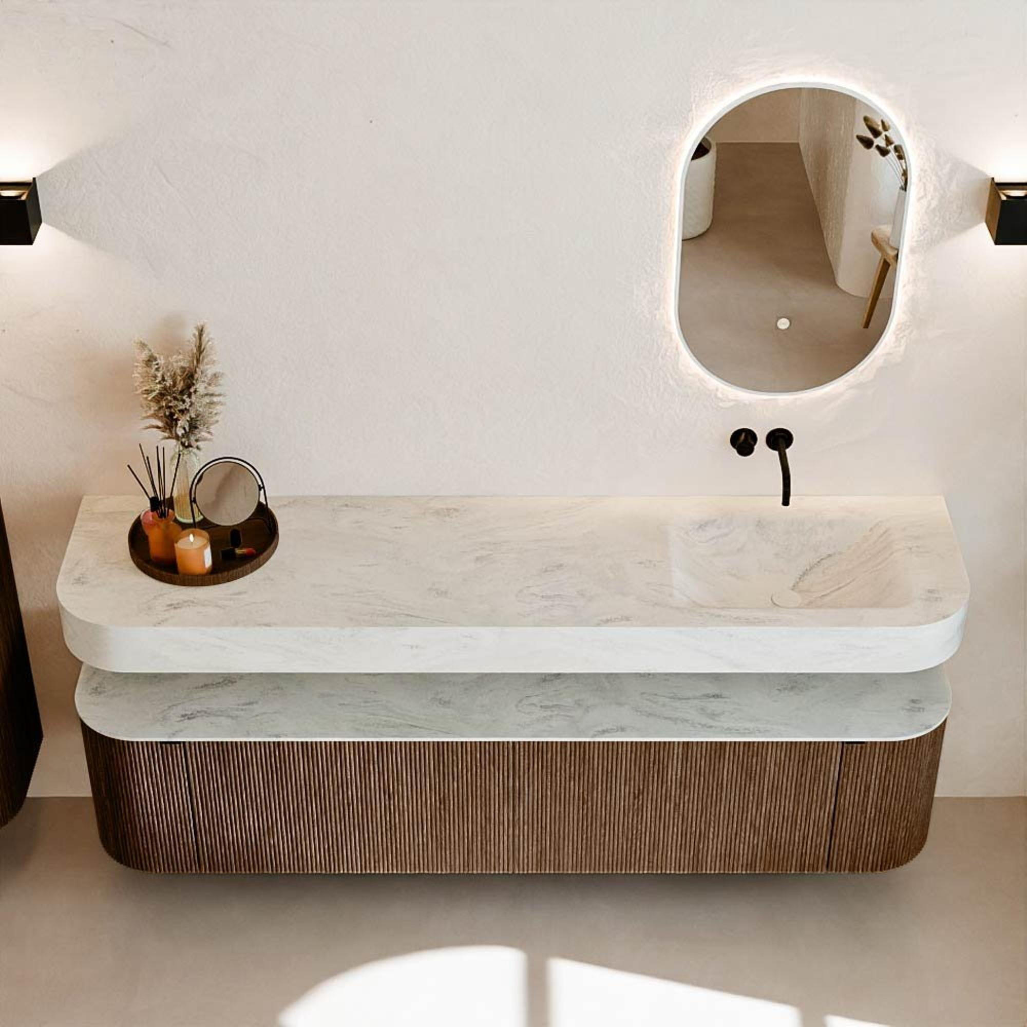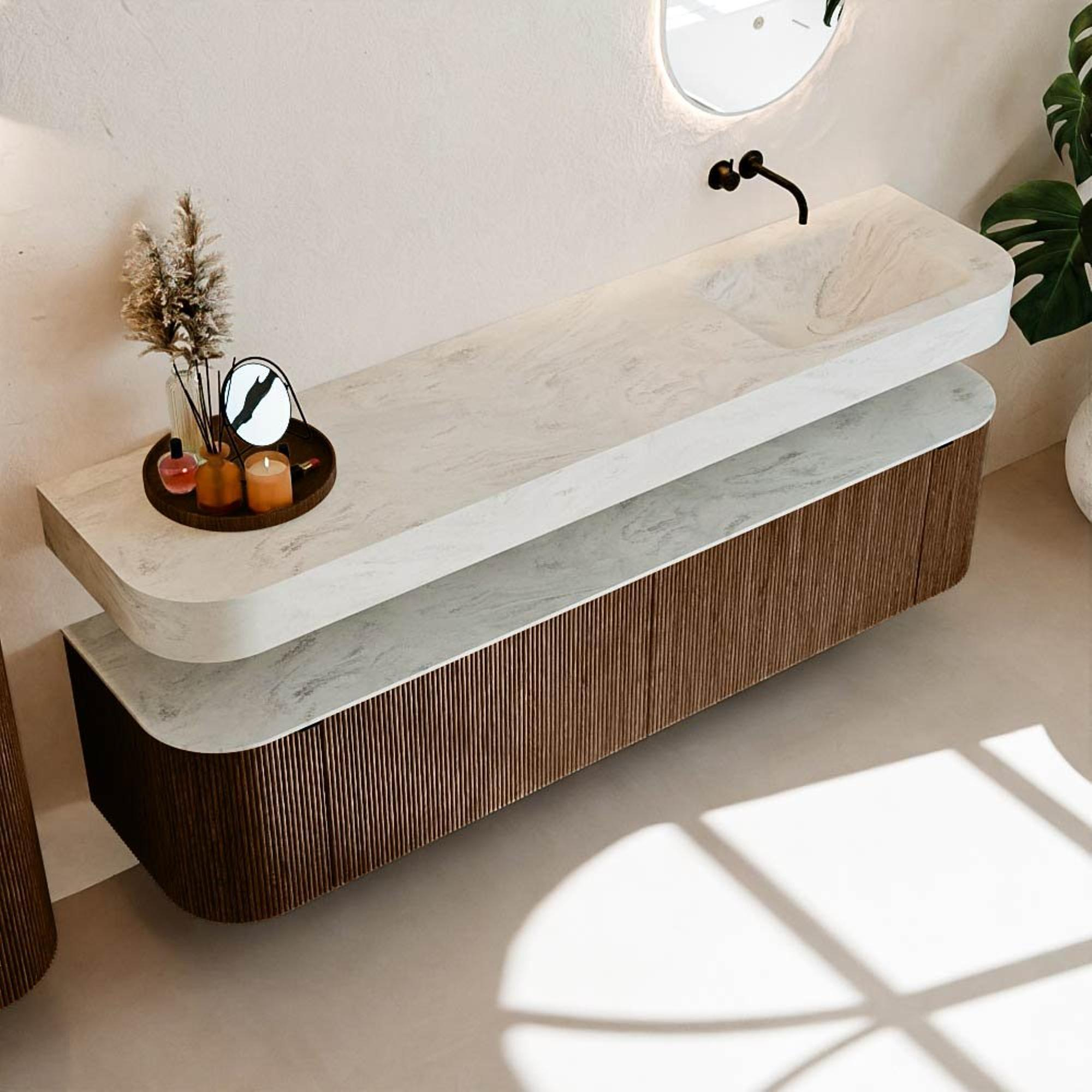 Au-dessus du meuble flotte une vasque suspendue assortie aux coins arrondis – parfaitement adaptée à la forme du meuble. La vasque est en Solid Surface et suit subtilement les lignes du meuble sous-jacent, créant un ensemble harmonieux. Le plan de travail en Solid Surface constitue une base solide, facile d'entretien et complète la combinaison.
