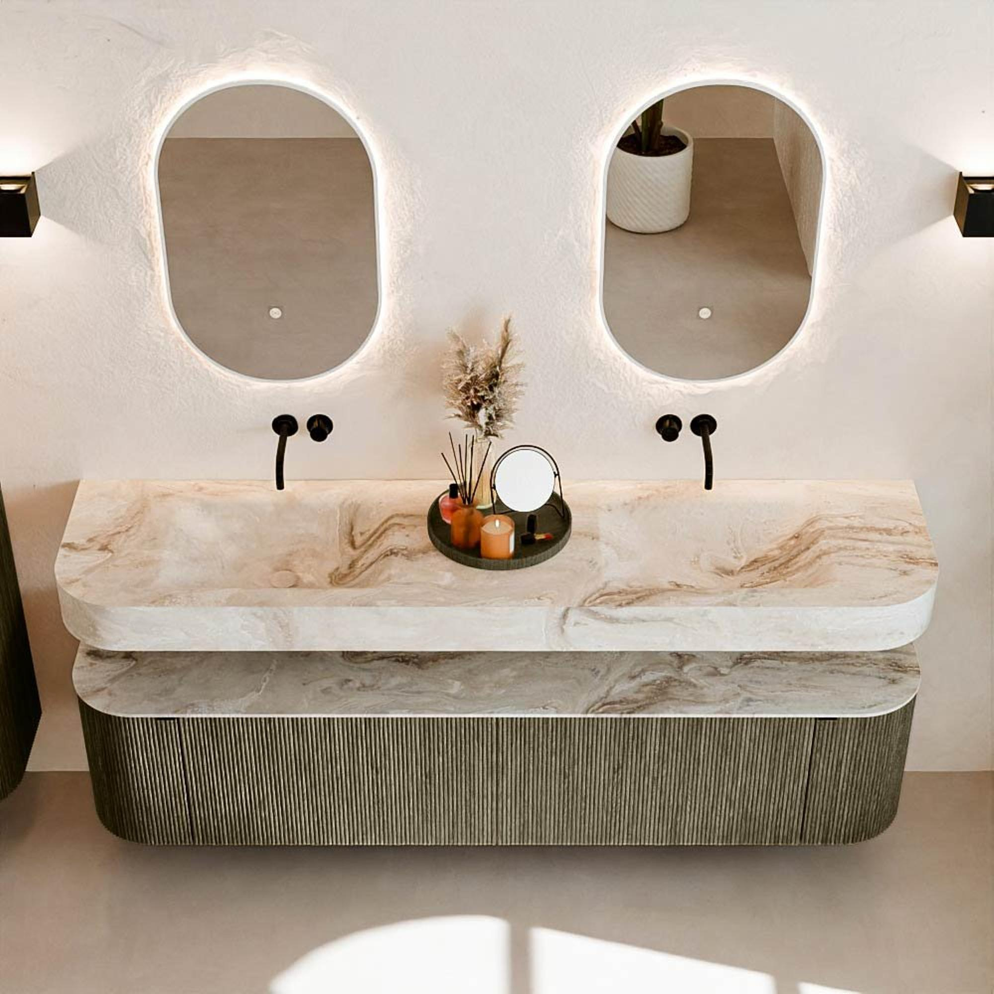 Au-dessus du meuble flotte une vasque suspendue assortie aux coins arrondis – parfaitement adaptée à la forme du meuble. La vasque est réalisée en Solid Surface et suit subtilement les lignes du meuble inférieur, créant ainsi un ensemble harmonieux. Le plan de travail en Solid Surface constitue une base solide et facile d'entretien, complétant la combinaison.