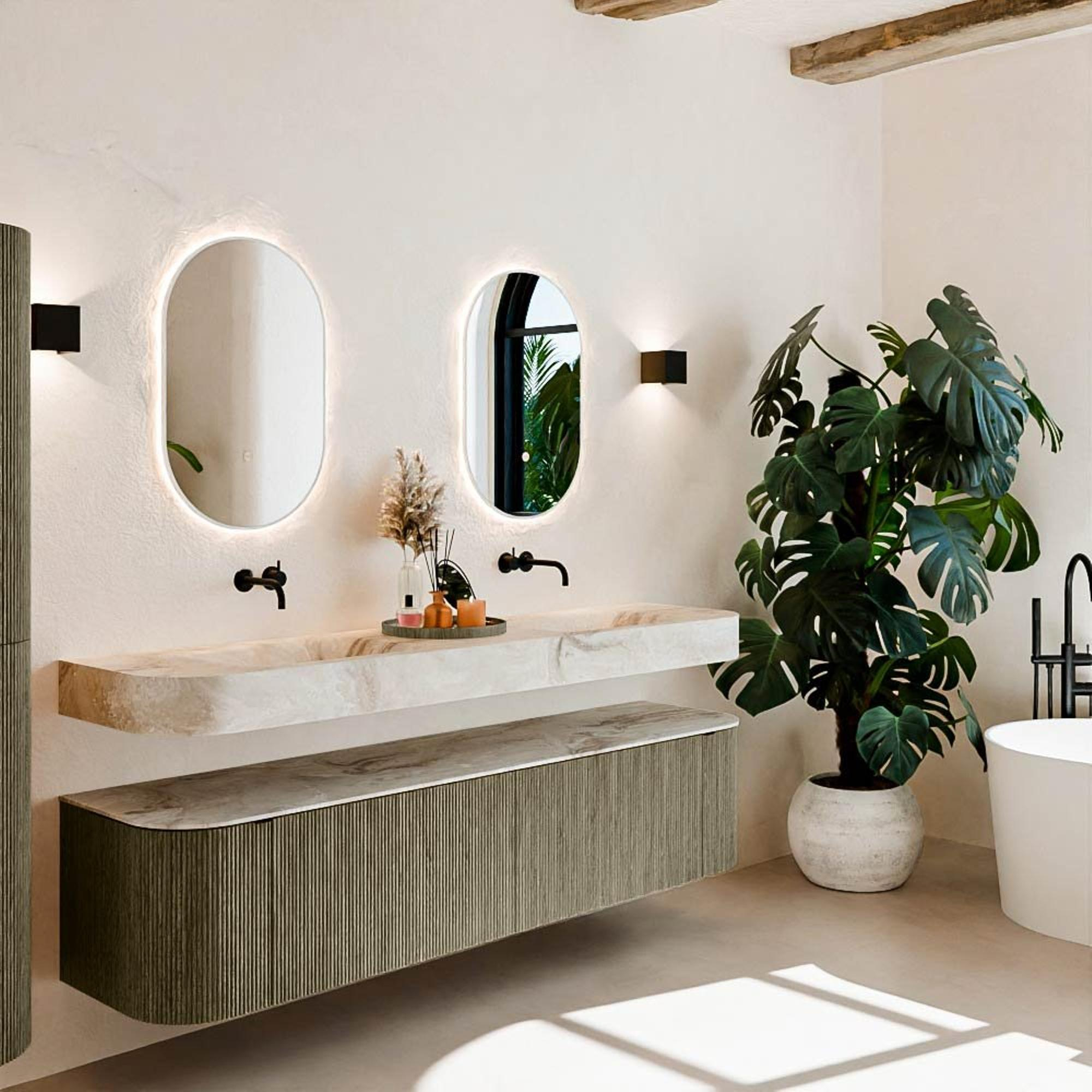 Matériaux naturels dans des tons chauds. Les rainures verticales apportent rythme et texture au design, tandis que le chêne confère une apparence chaleureuse et artisanale. Choisissez parmi 5 teintes de bois OAK, WALNUT, DUSK, SHADOW et RUBY, des couleurs de bois soigneusement sélectionnées pour enrichir les salles de bains modernes et classiques.