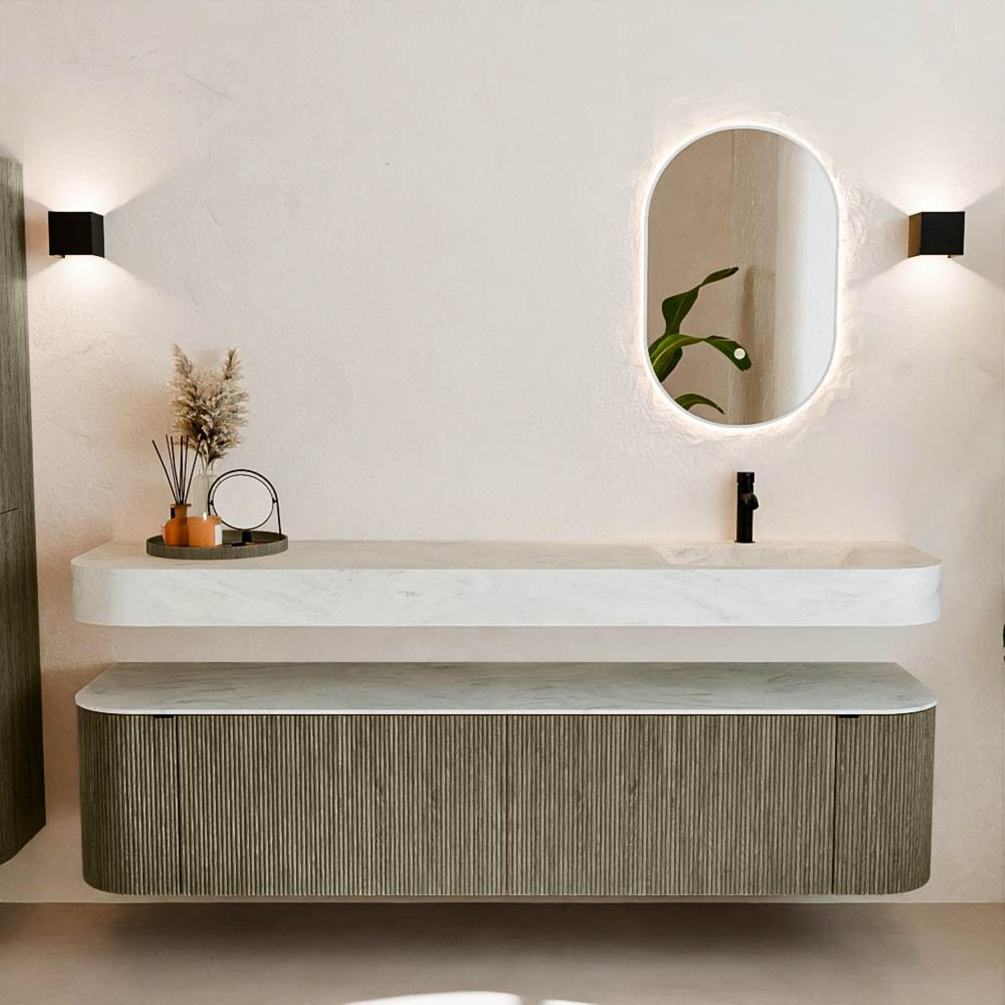 Au-dessus du meuble flotte une vasque suspendue assortie aux coins arrondis – parfaitement adaptée à la forme du meuble. La vasque est en Solid Surface et suit subtilement les lignes du meuble inférieur, créant un ensemble harmonieux. Le plan de travail en Solid Surface forme une base solide, facile d'entretien, et complète la combinaison.