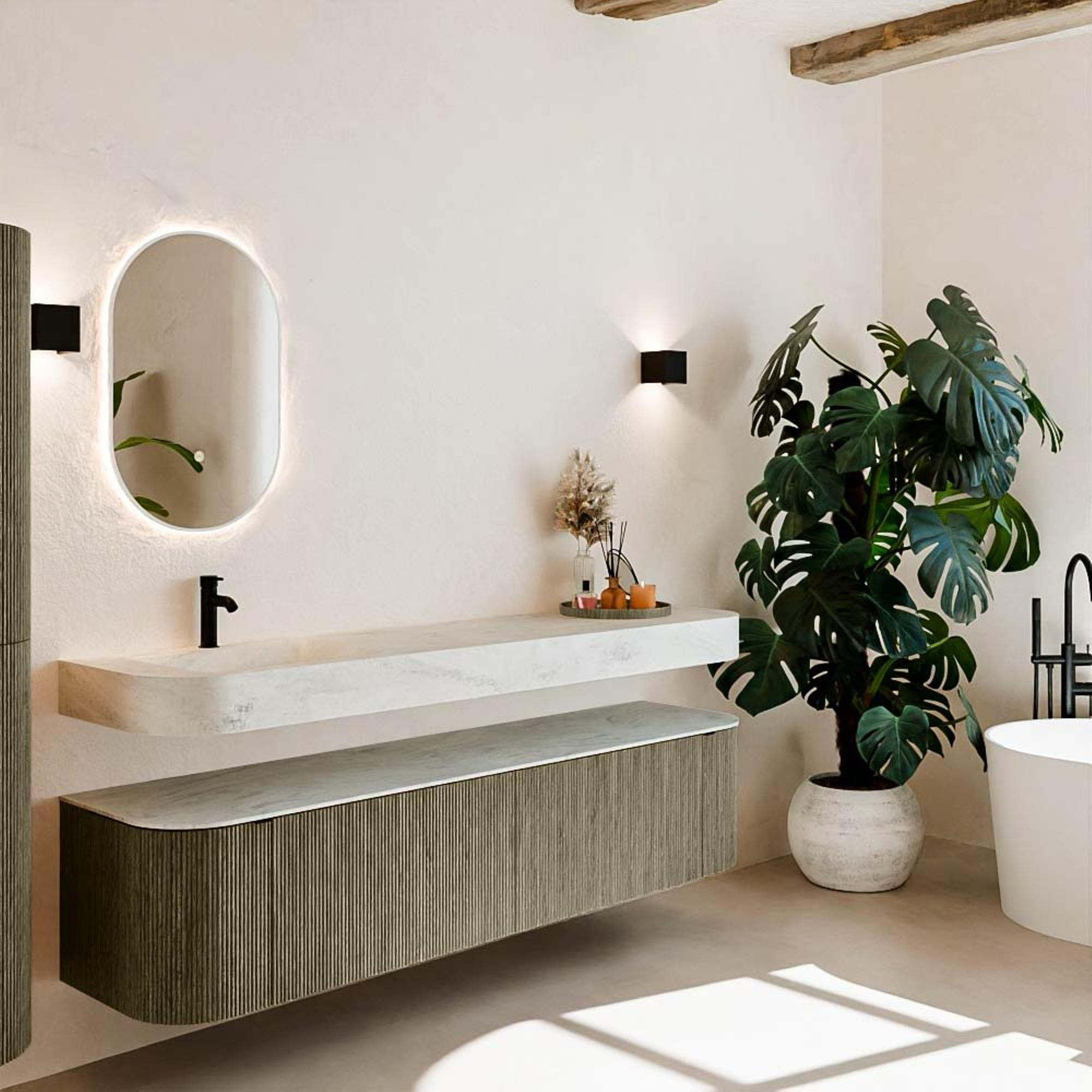 Matériaux naturels dans des tons chauds. Les nervures verticales apportent rythme et texture au design, tandis que le chêne confère une apparence chaleureuse et artisanale. Choisissez parmi 5 teintes de bois OAK, WALNUT, DUSK, SHADOW et RUBY, des couleurs de bois soigneusement sélectionnées pour enrichir les salles de bains modernes et classiques.