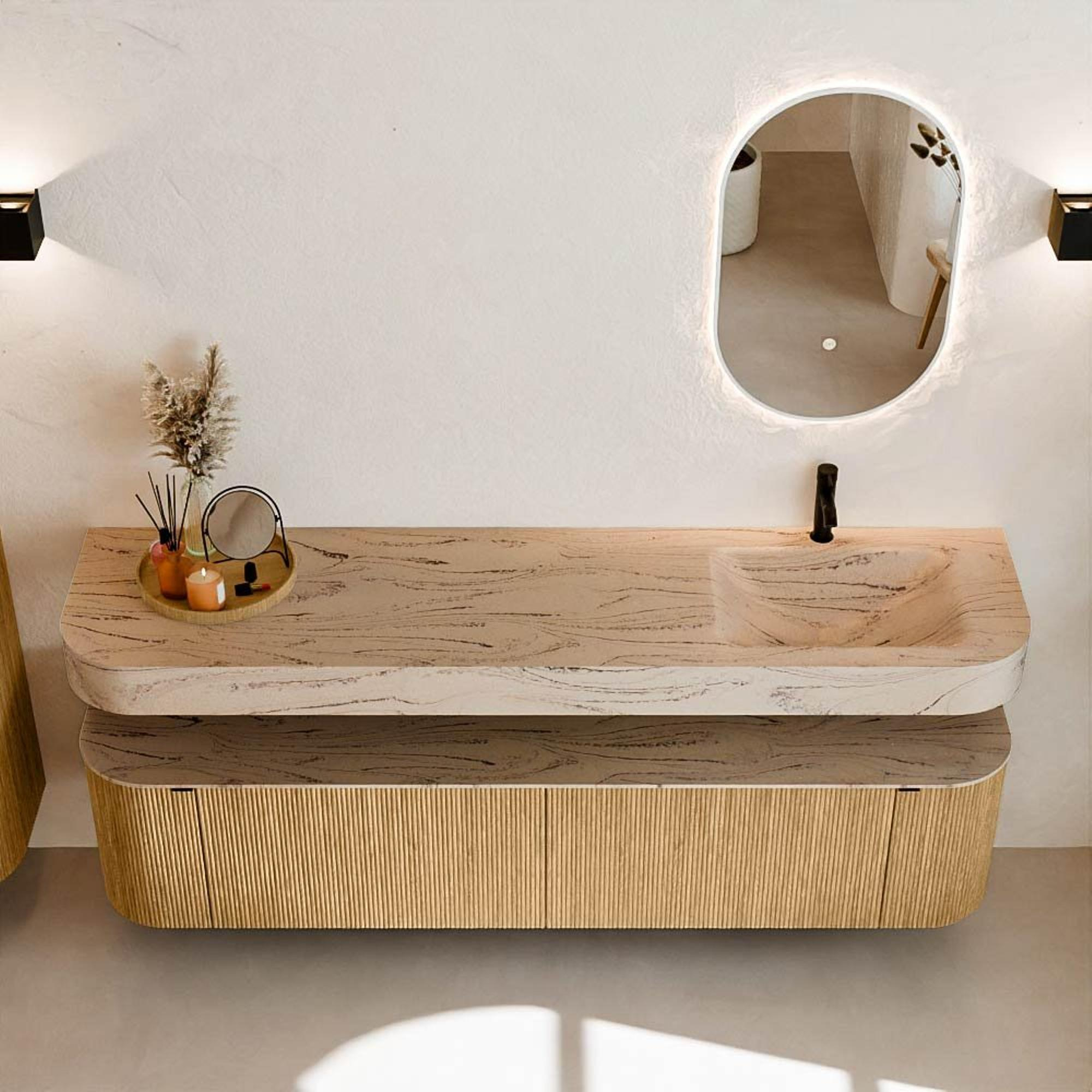 MONDIAZ THOR-DLUX 190cm meuble de salle de bains arrondi gauche + droite couleur Oak avec 2 tiroirs et 2 portes. Vasque suspendue CLOUD droite 1 trou de robinet couleur Arena.