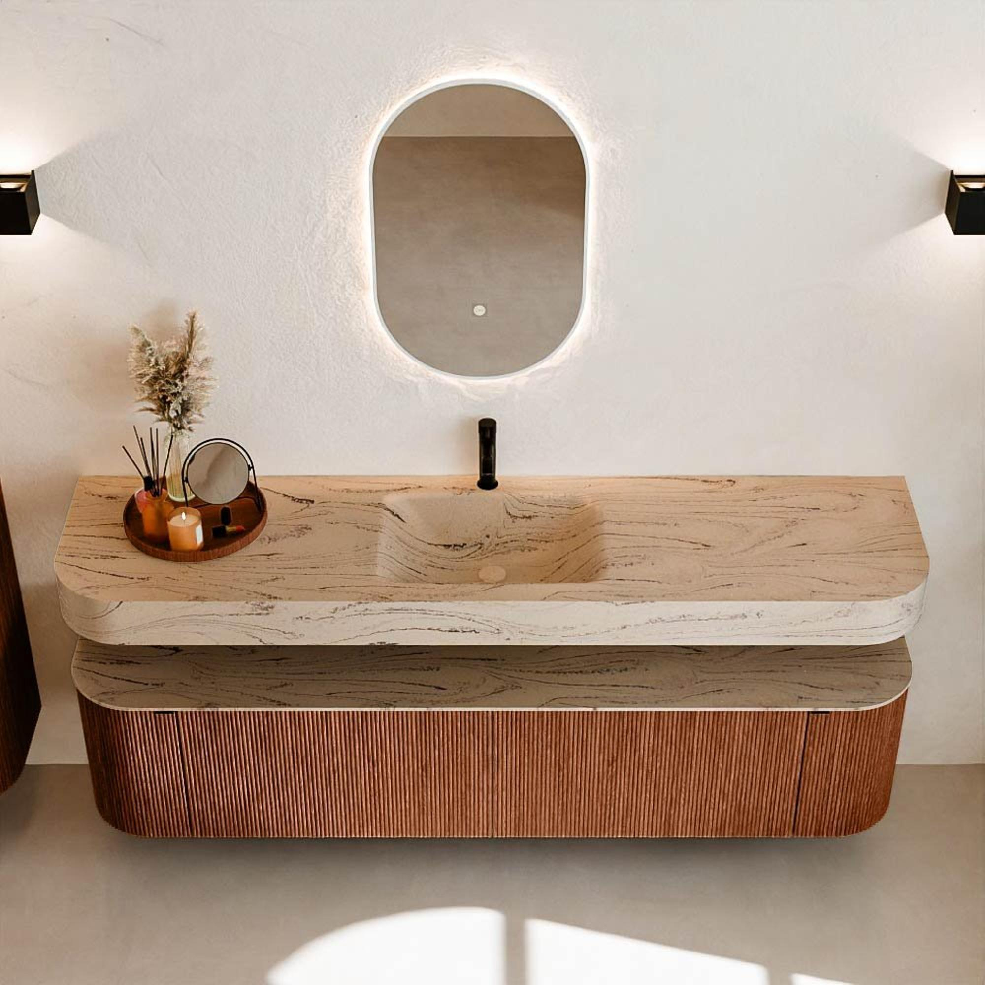 Matériaux naturels dans des tons chauds. Les nervures verticales apportent rythme et texture au design, tandis que le chêne confère une apparence chaleureuse et artisanale. Choisissez parmi 5 teintes de bois OAK, WALNUT, DUSK, SHADOW et RUBY, des couleurs de bois soigneusement sélectionnées pour enrichir les salles de bains modernes et classiques.