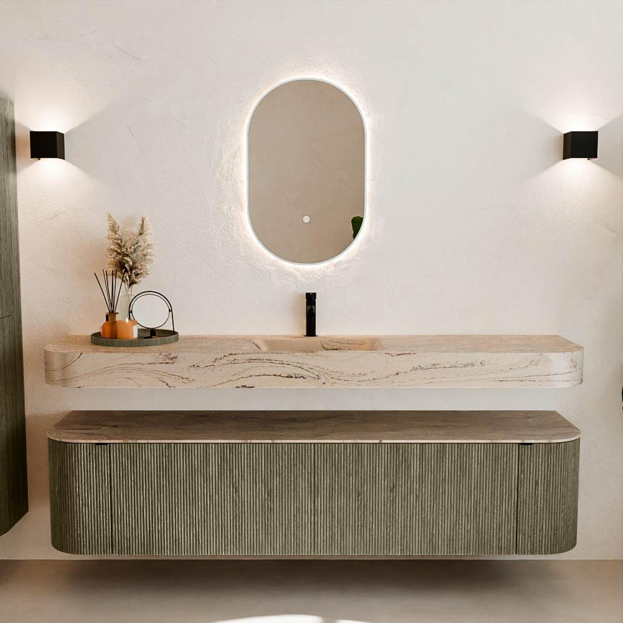 Matériaux naturels dans des tons chauds. Les nervures verticales apportent rythme et texture au design, tandis que le chêne confère une apparence chaleureuse et artisanale. Choisissez parmi 5 teintes de bois OAK, WALNUT, DUSK, SHADOW et RUBY, des couleurs de bois soigneusement sélectionnées pour enrichir les salles de bains modernes et classiques.