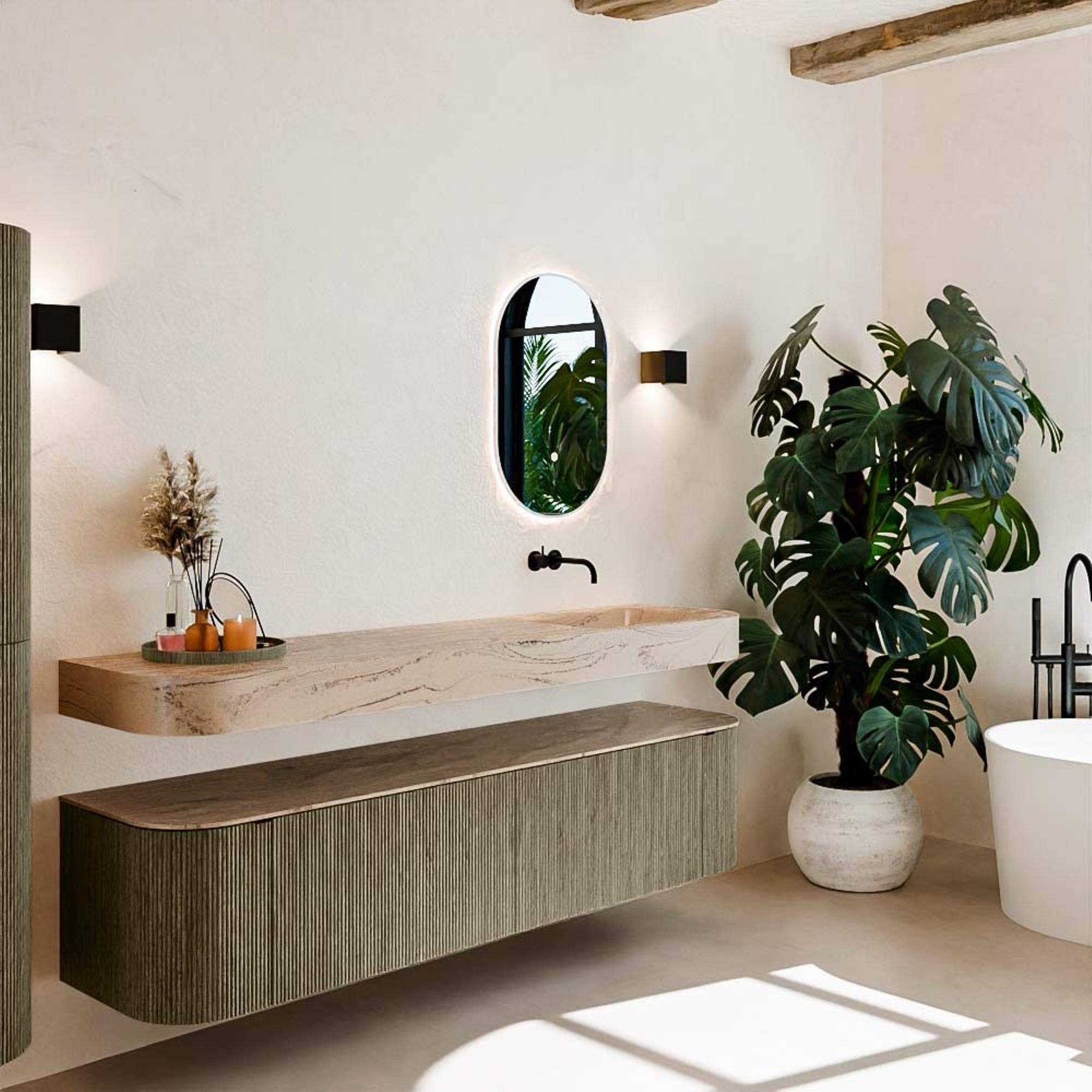 Matériaux naturels dans des tons chauds. Les nervures verticales apportent rythme et texture au design, tandis que le chêne confère une apparence chaleureuse et artisanale. Choisissez parmi 5 teintes de bois OAK, WALNUT, DUSK, SHADOW et RUBY, des couleurs de bois soigneusement sélectionnées pour enrichir les salles de bains modernes et classiques.