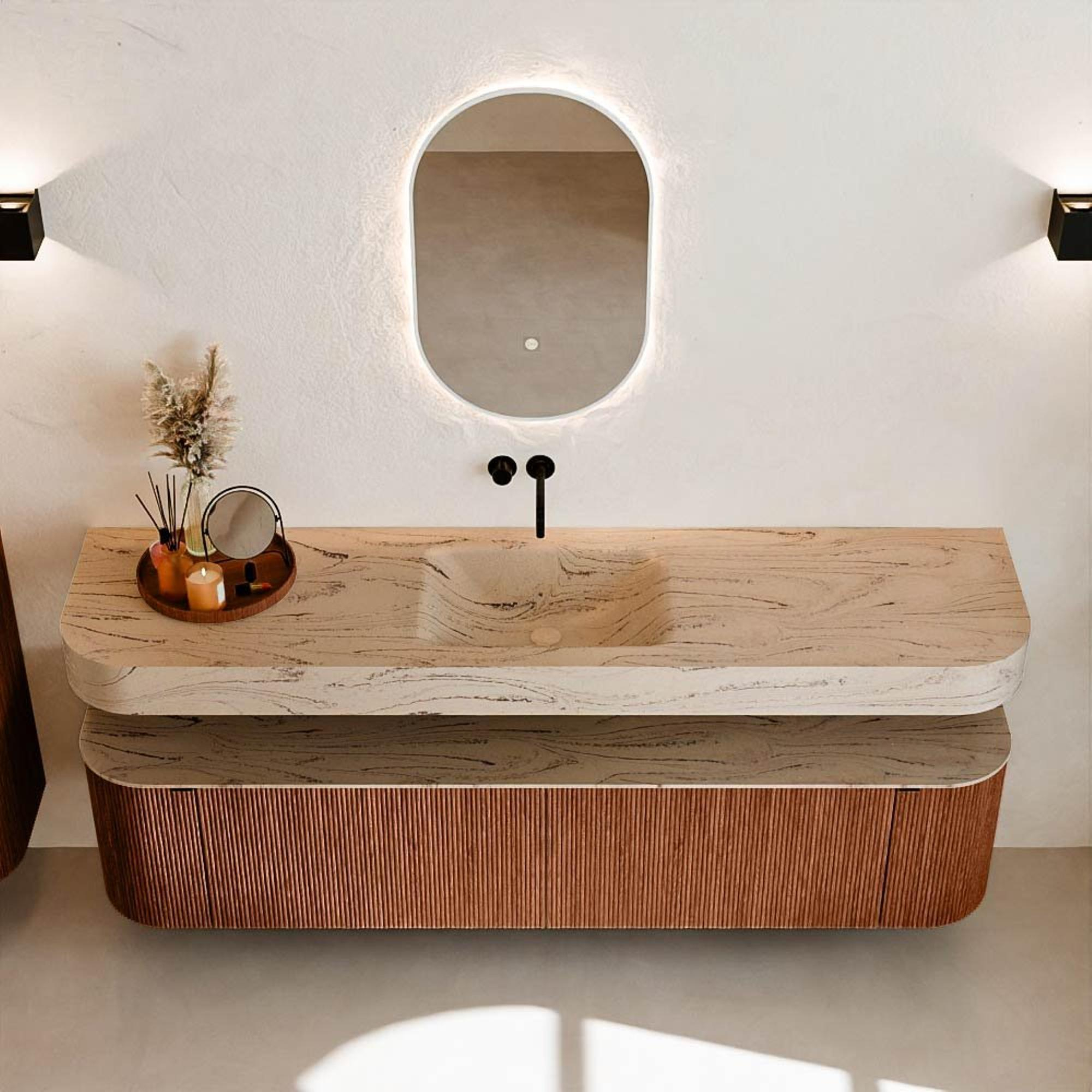 Matériaux naturels dans des tons chauds. Les nervures verticales apportent rythme et texture au design, tandis que le chêne confère une apparence chaleureuse et artisanale. Choisissez parmi 5 teintes de bois OAK, WALNUT, DUSK, SHADOW et RUBY, des couleurs de bois soigneusement sélectionnées pour enrichir les salles de bains modernes et classiques.