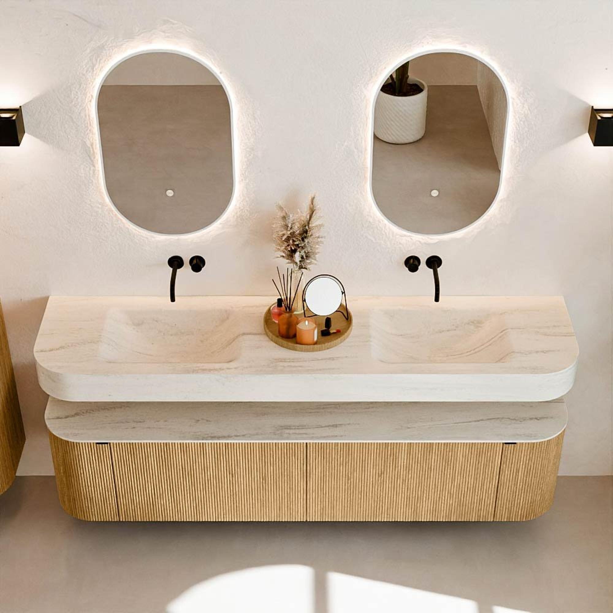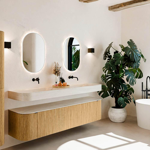 Matériaux naturels dans des tons chauds. Les nervures verticales apportent rythme et texture au design, tandis que le chêne confère une apparence chaleureuse et artisanale. Choisissez parmi 5 teintes de bois OAK, WALNUT, DUSK, SHADOW et RUBY, des couleurs de bois soigneusement sélectionnées pour enrichir les salles de bains modernes et classiques.