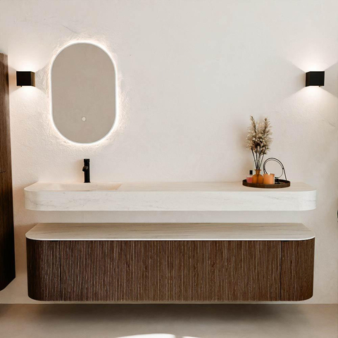 Au-dessus du meuble flotte une vasque suspendue assortie aux coins arrondis – parfaitement adaptée à la forme du meuble. La vasque est en Solid Surface et suit subtilement les lignes du meuble inférieur, créant un ensemble harmonieux. Le plan de travail en Solid Surface constitue une base solide et facile d'entretien, complétant la combinaison.