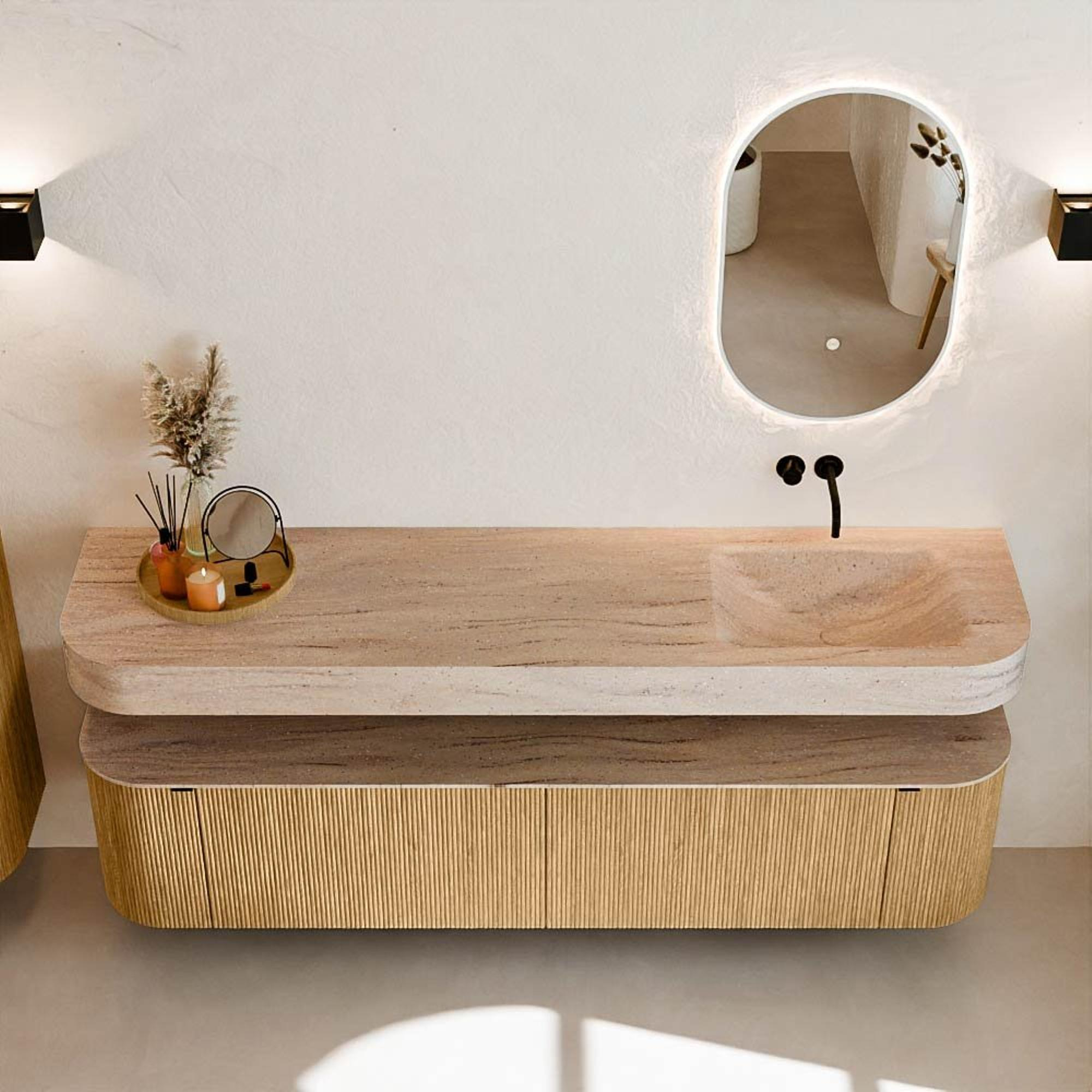 Au-dessus du meuble flotte une vasque suspendue assortie aux coins arrondis – parfaitement adaptée à la forme du meuble. La vasque est réalisée en Solid Surface et suit subtilement les lignes du meuble inférieur, créant un ensemble harmonieux. Le plan de travail en Solid Surface forme une base solide et facile d'entretien et complète la combinaison.