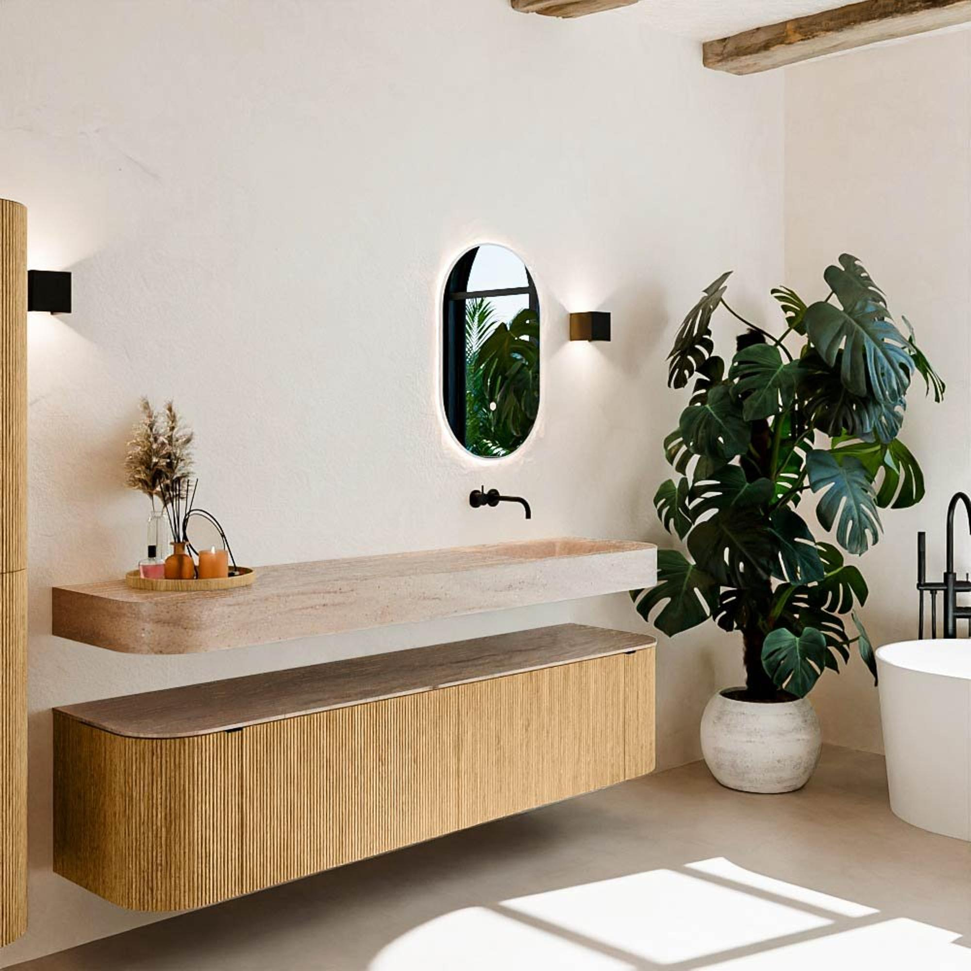 Matériaux naturels dans des tons chauds. Les reliefs verticaux apportent rythme et texture au design, tandis que le chêne confère une apparence chaleureuse et artisanale. Choisissez parmi 5 teintes de bois OAK, WALNUT, DUSK, SHADOW et RUBY, des couleurs de bois soigneusement sélectionnées pour enrichir les salles de bains modernes et classiques.