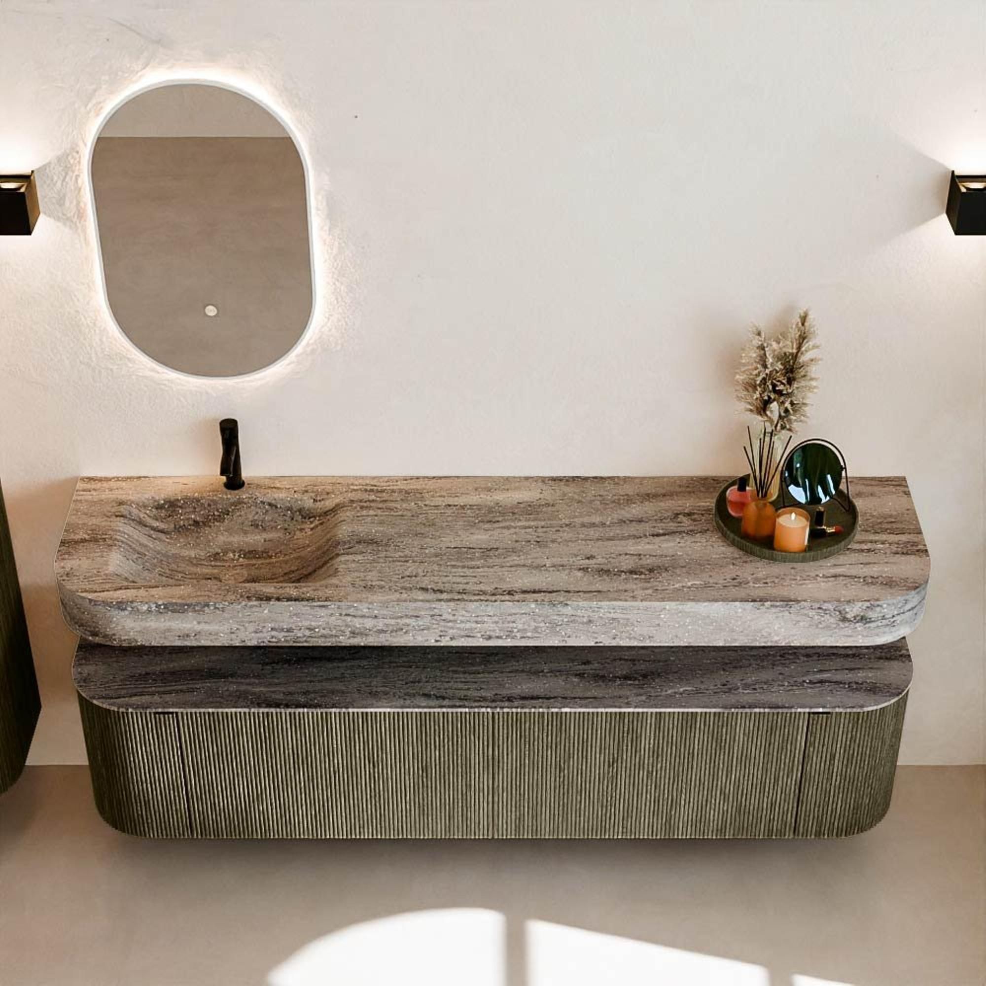 Matériaux naturels dans des tons chauds. Les nervures verticales apportent rythme et texture au design, tandis que le chêne confère une apparence chaleureuse et artisanale. Choisissez parmi 5 teintes de bois OAK, WALNUT, DUSK, SHADOW et RUBY, des couleurs de bois soigneusement sélectionnées pour enrichir les salles de bains modernes et classiques.