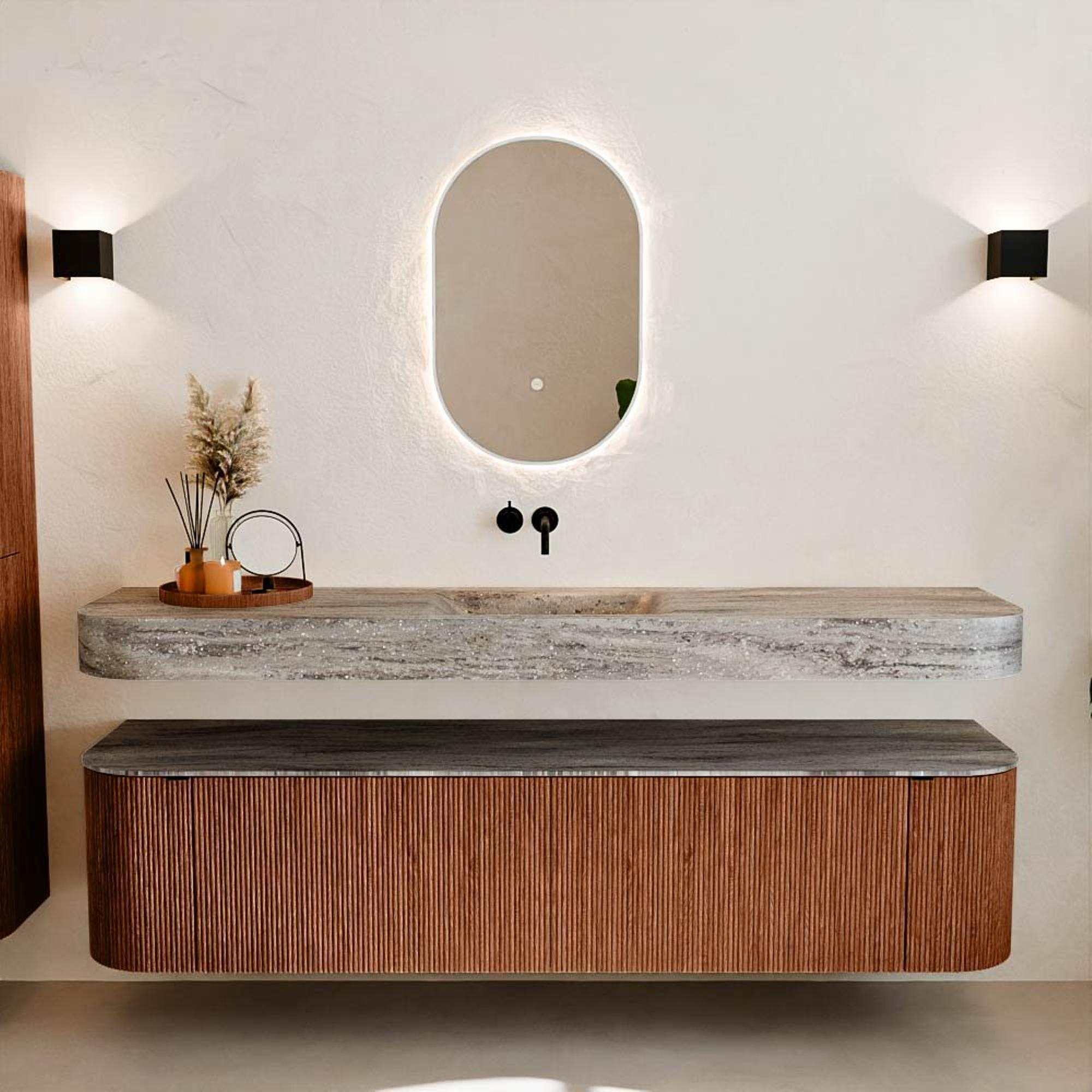 Matériaux naturels dans des tons chauds. Les nervures verticales apportent rythme et texture au design, tandis que le chêne confère une apparence chaleureuse et artisanale. Choisissez parmi 5 teintes de bois OAK, WALNUT, DUSK, SHADOW et RUBY, des couleurs de bois soigneusement sélectionnées pour enrichir les salles de bains modernes et classiques.