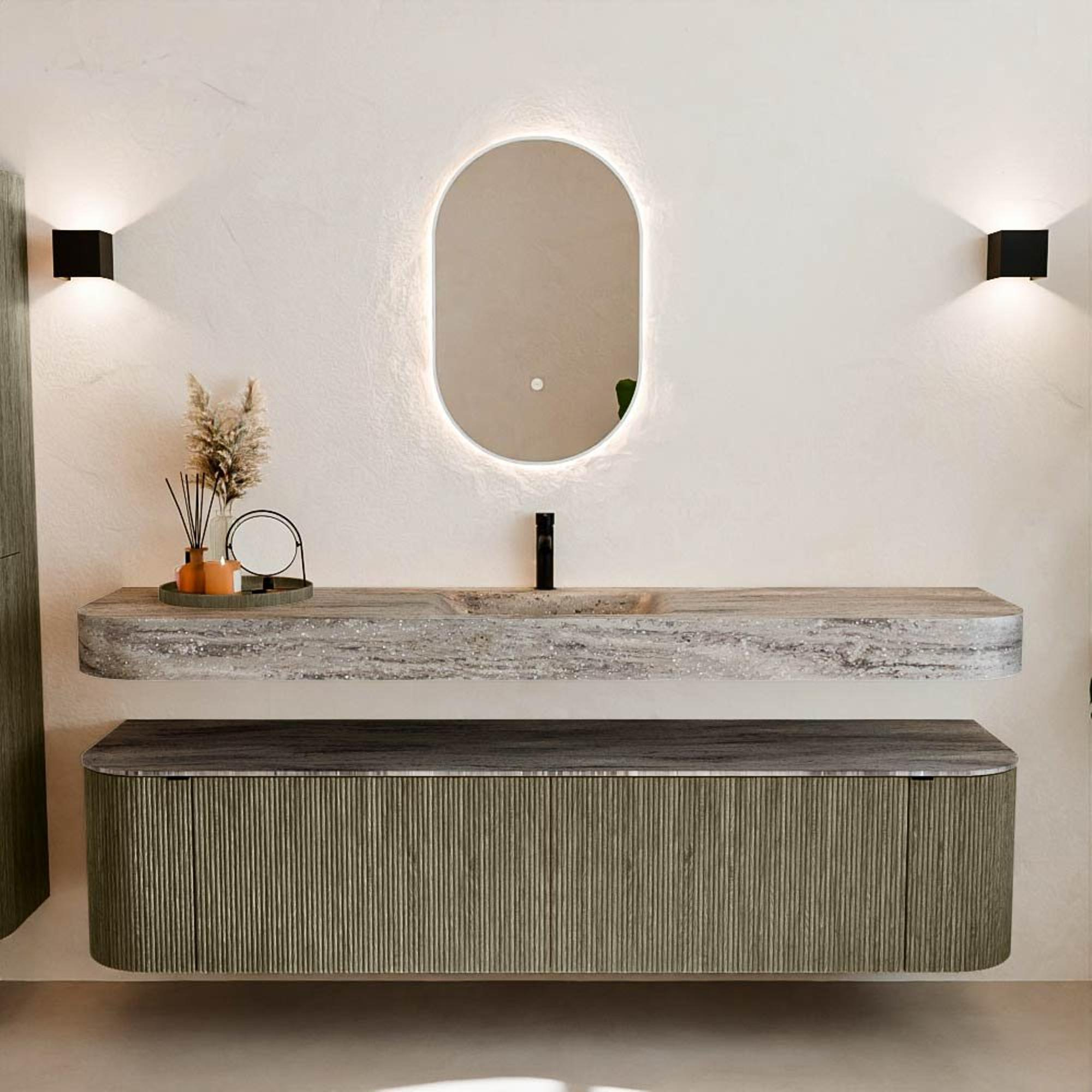 Au-dessus du meuble flotte une vasque suspendue assortie aux coins arrondis – parfaitement adaptée à la forme du meuble. La vasque est réalisée en Solid Surface et suit subtilement les lignes du meuble inférieur, créant ainsi un ensemble harmonieux. Le plan de travail en Solid Surface forme une base solide, facile d'entretien, et complète la combinaison.