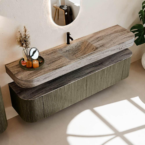 Matériaux naturels dans des tons chauds. Les rainures verticales apportent rythme et texture au design, tandis que le chêne confère une apparence chaleureuse et artisanale. Choisissez parmi 5 teintes de bois OAK, WALNUT, DUSK, SHADOW et RUBY, des couleurs de bois soigneusement sélectionnées pour enrichir les salles de bains modernes et classiques.